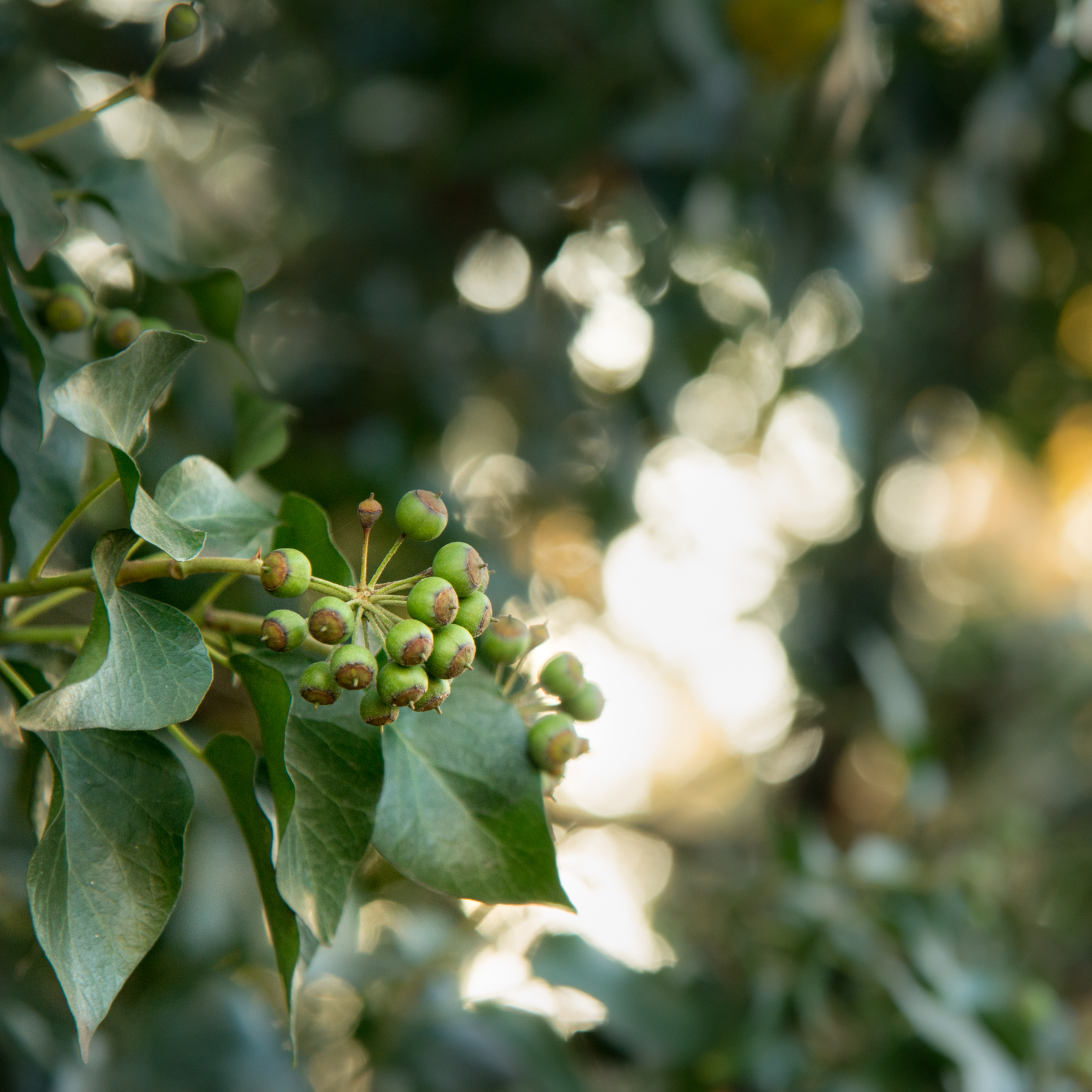 Fruchtdolde eines alten Efeus neben strahlenden Lichtflecken