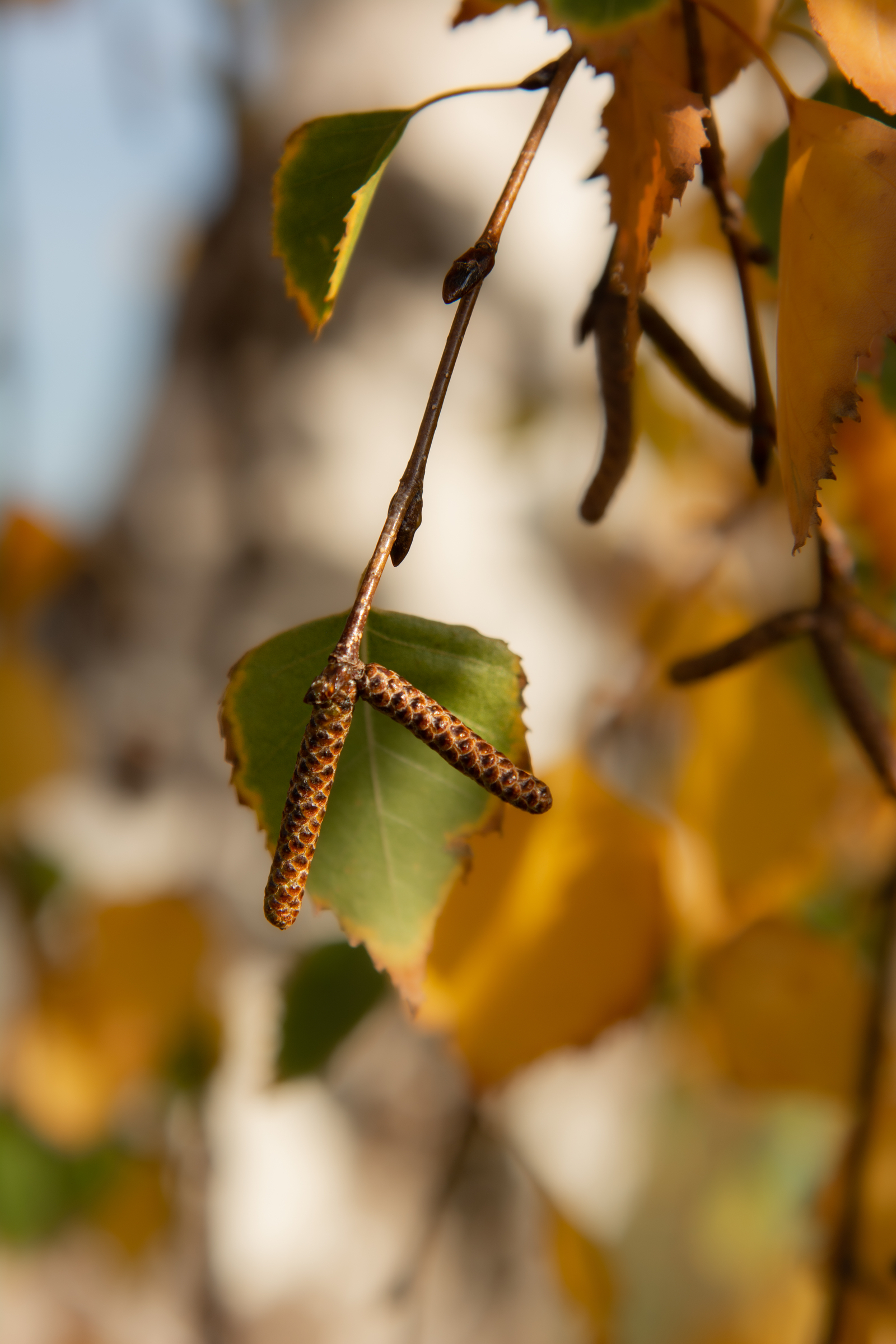 Birkenzweige mit unreifen Birkenkätzchen und herbstlichem Laub vor Stamm des Baums