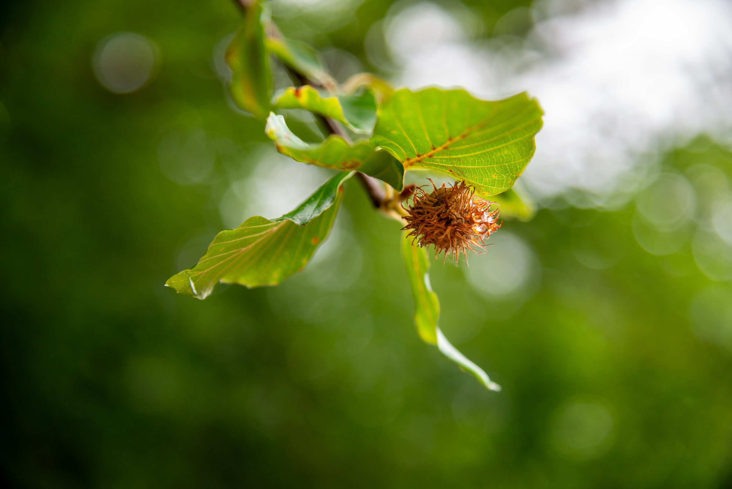 Zweig einer Rotbuche mit einer kleinen Buchecker, die sich in ihrer stacheligen Hülle entwickelt. Die Blätter und der Zweig, an dem die Frucht hängt, stehen noch klar im Fokus, doch der Hintergrund wirkt wie eine diffuse grüne Leinwand, die die Details der Buchecker noch stärker hervorhebt. Das Licht im Hintergrund zerstreut sich in kreisförmigen Mustern, was dem Bild eine fast malerische Qualität verleiht. Bild mit kleinerer Blende zum Vergleich: ›Buchecker9485‹