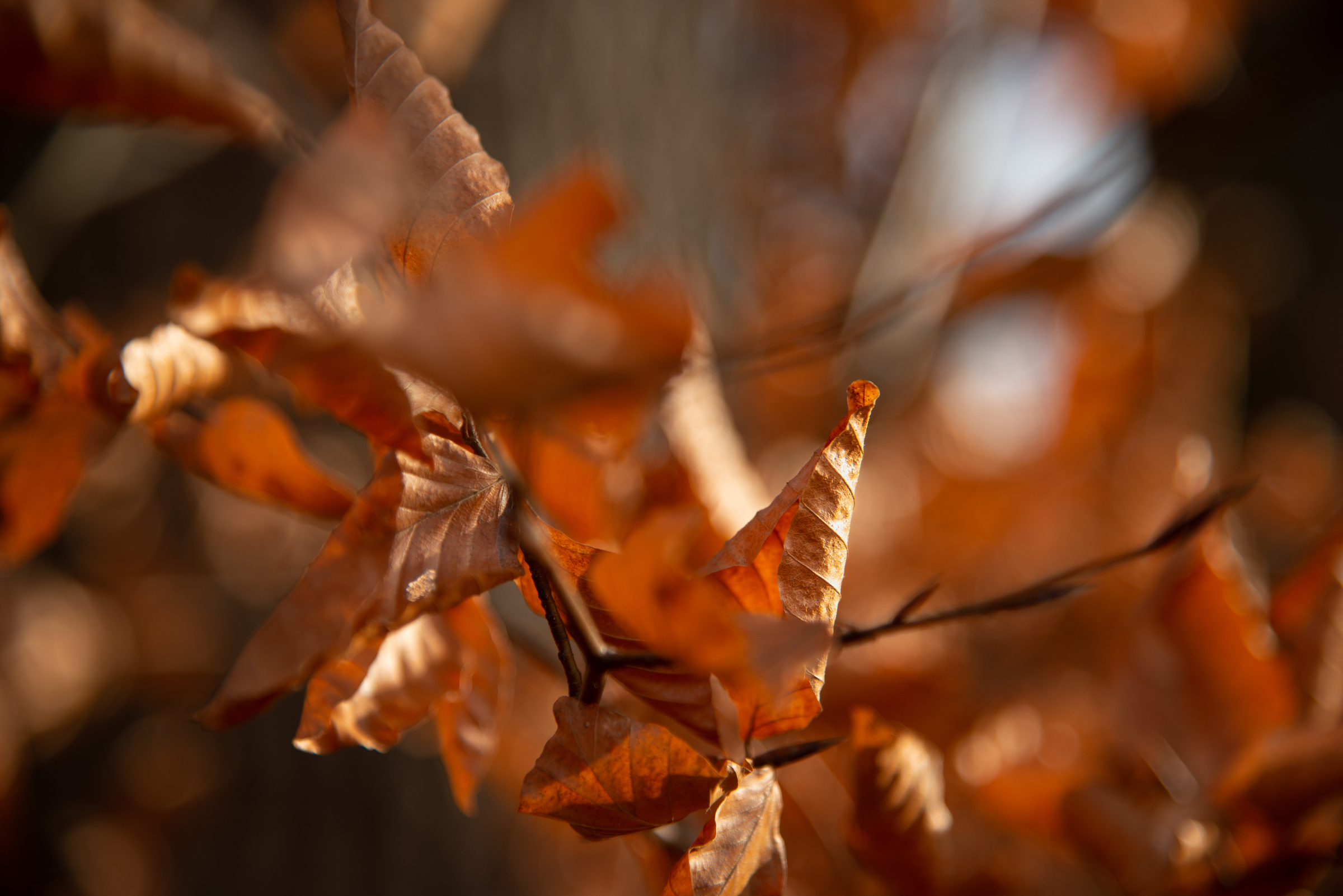 Buchenblatt an einem noch dicht belaubtem Zweig im Winter