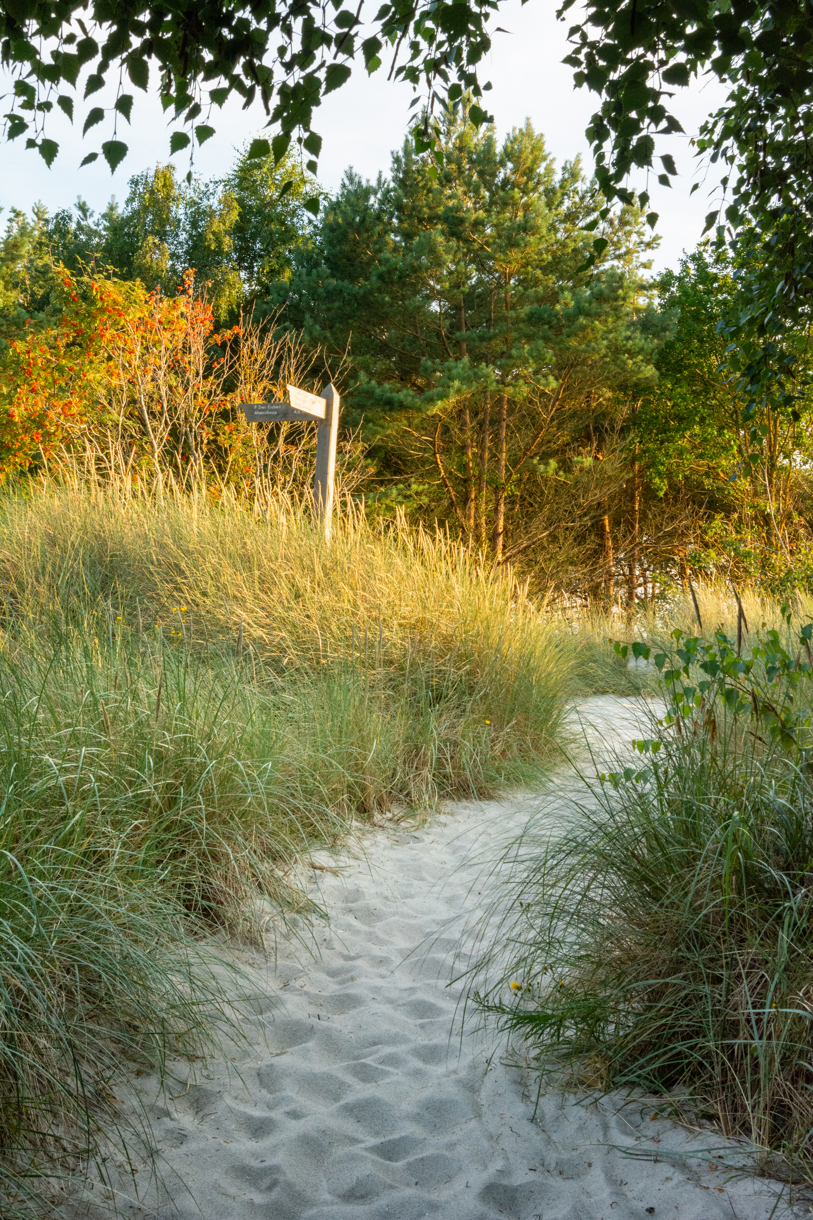 Dünenpfad durch Gräser im Abendlicht vom Wald zum Strand