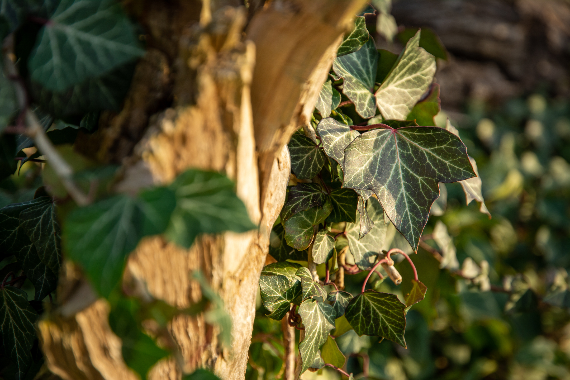 Efeublatt neben einem abgebrochenen Baum in der Sonne