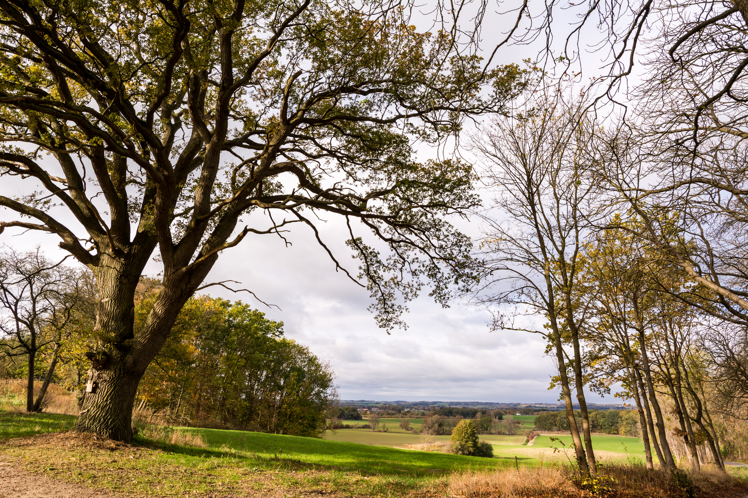 Eine alte Eiche gibt den Blick auf eine Landschaft von Wäldern und Feldern frei unter einem bewölkten Himmel