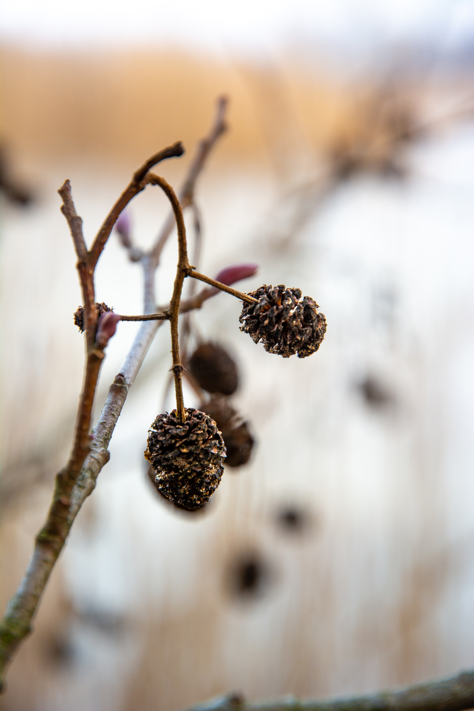 Erlenkätzchen vor einem zugefrorenen See unscharf im Hintergrund Erlenkätzchen4964