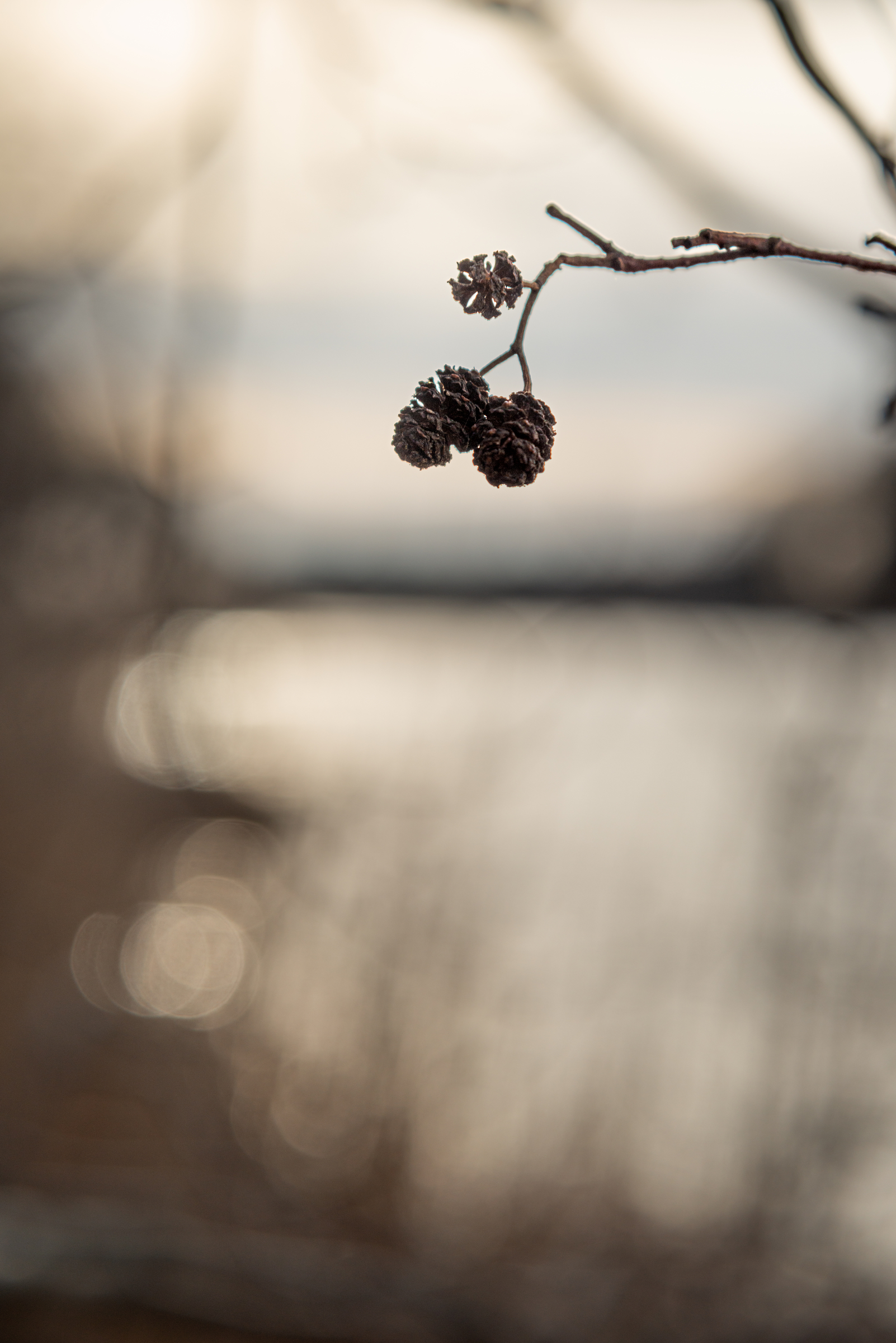 Vertrocknete Kätzchen einer Erle mit einem sehr unscharfen See im Hintergrund