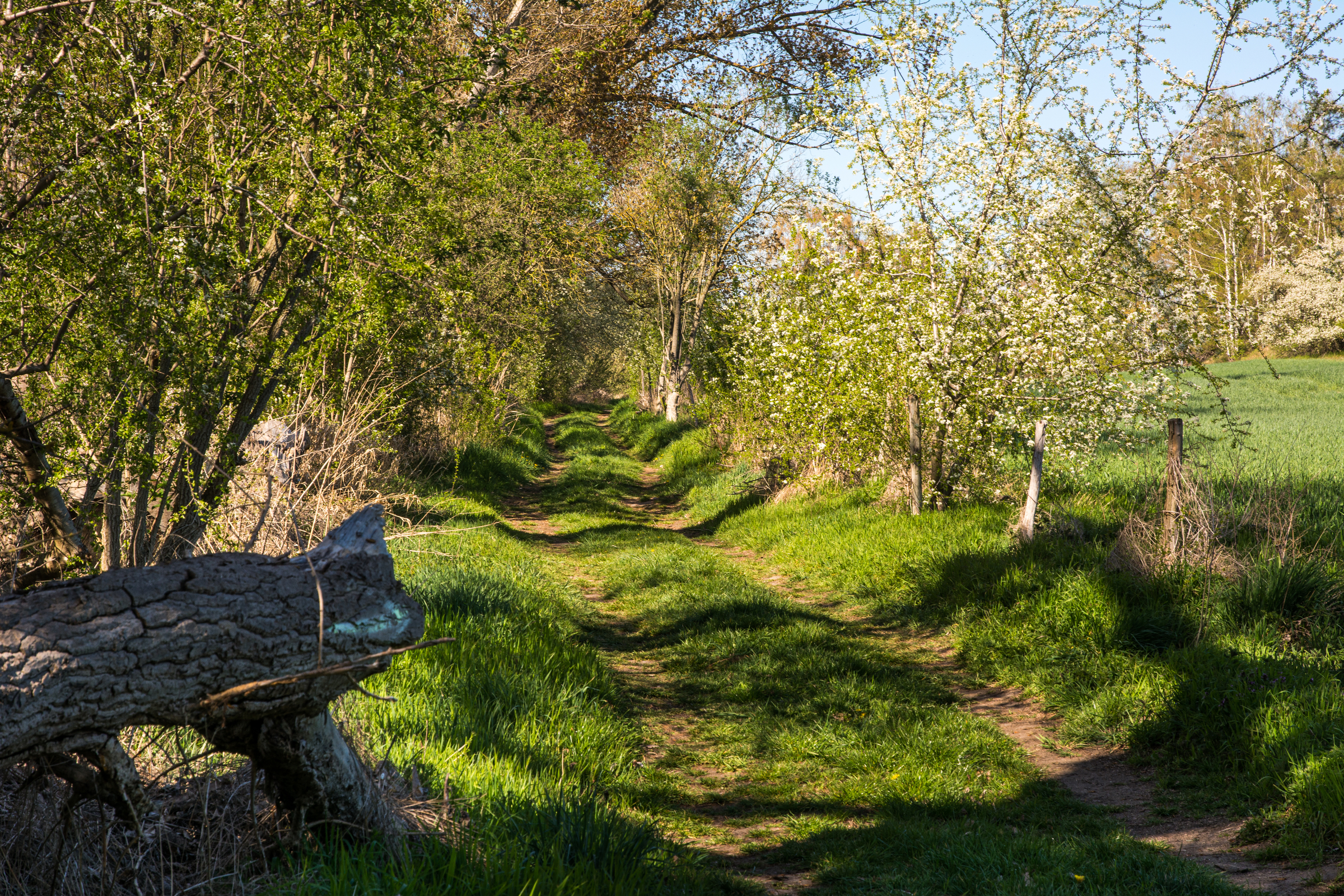 Der Weg führt in einen Tunnel von Bäumen und Büschen, deren frisches Blattwerk sich dieser Tage entfaltet.