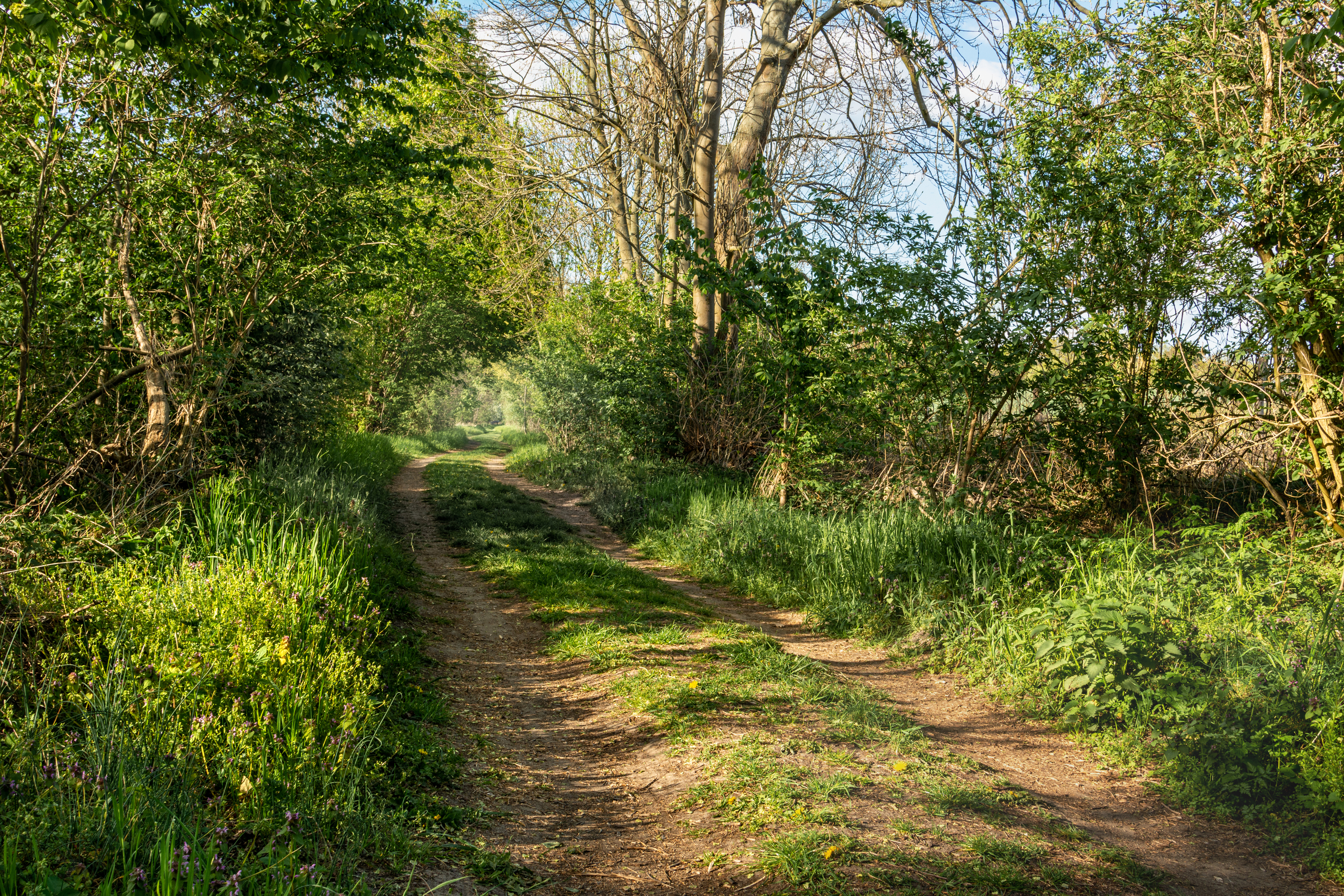 Feldweg mit üppigem Grün Ende April bei blauem Himmel