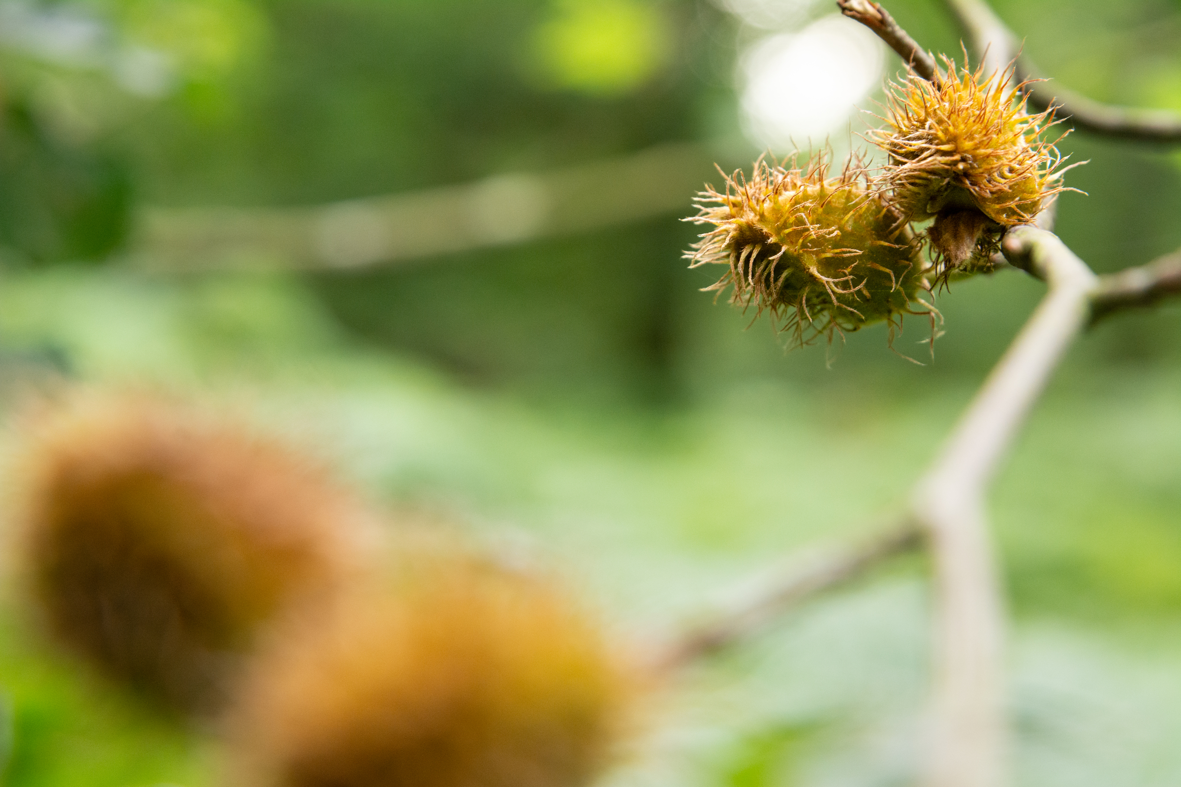 Zwei Buchnüsse mit ihren stacheligen Fruchthüllen an einem dünnen Zweig. Der Hintergrund besteht aus grünem Blattwerk an den Ästen des Laubbaums, das aber vollkommen in Unschärfe zerfließt. Zwei weitere Früchte des Baums bilden einen unscharfen Vordergrund, so dass das Foto nach dem klassischen Muster von Vordergrund-Motivgrund-Hintergrund komponiert ist.