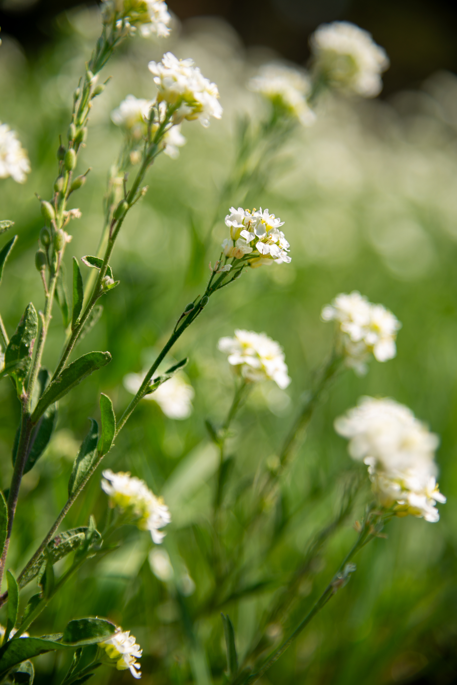 In einem Feld von Graukresse (Berteroa incana) steht vor allem eine Blüte im Fokus, während die anderen durch Unschärfe in der Tiefe zu weißen Bokeh-Kreisen vor grünem Hintergrund werden. Die Tiefenschärfe reicht kaum, dass die Pflanzen in der Nähe der fokussierten Blüte noch ihre Struktur zeigen. ›Graukresse9718‹ ist dasselbe Motiv, wurde aber mit kleinerer Blende aufgenommen, so dass es eine etwas geringere Unschärfe in der Tiefe zeigt.
