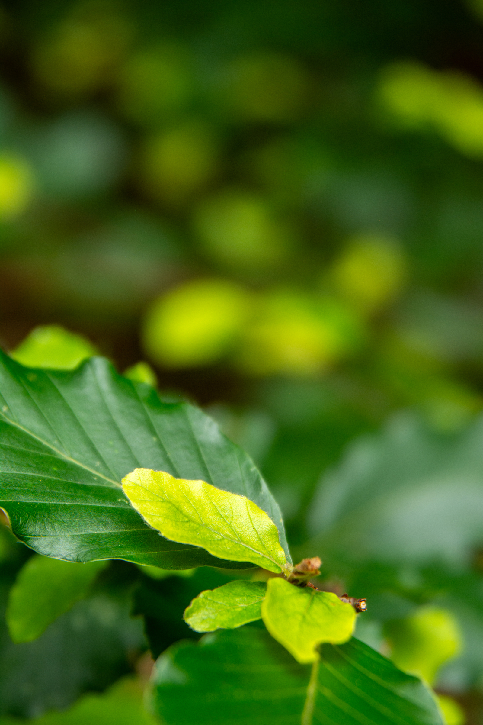 Belaubte Zweige und Äste mit jungen, hellgrünen Blättern; üppige Waldvegetation, die im Hintergrund verträumt unscharf wird.