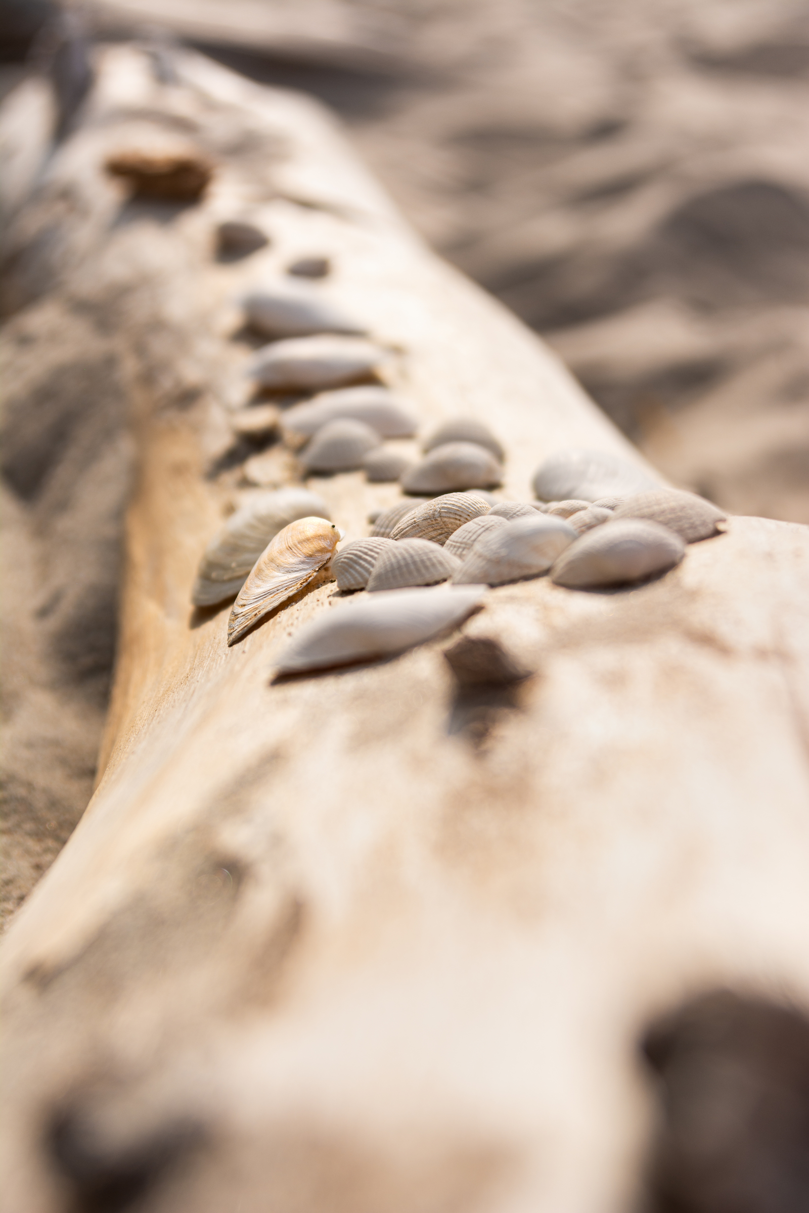 Muschelsammlung auf einem verwitterten Baumstamm