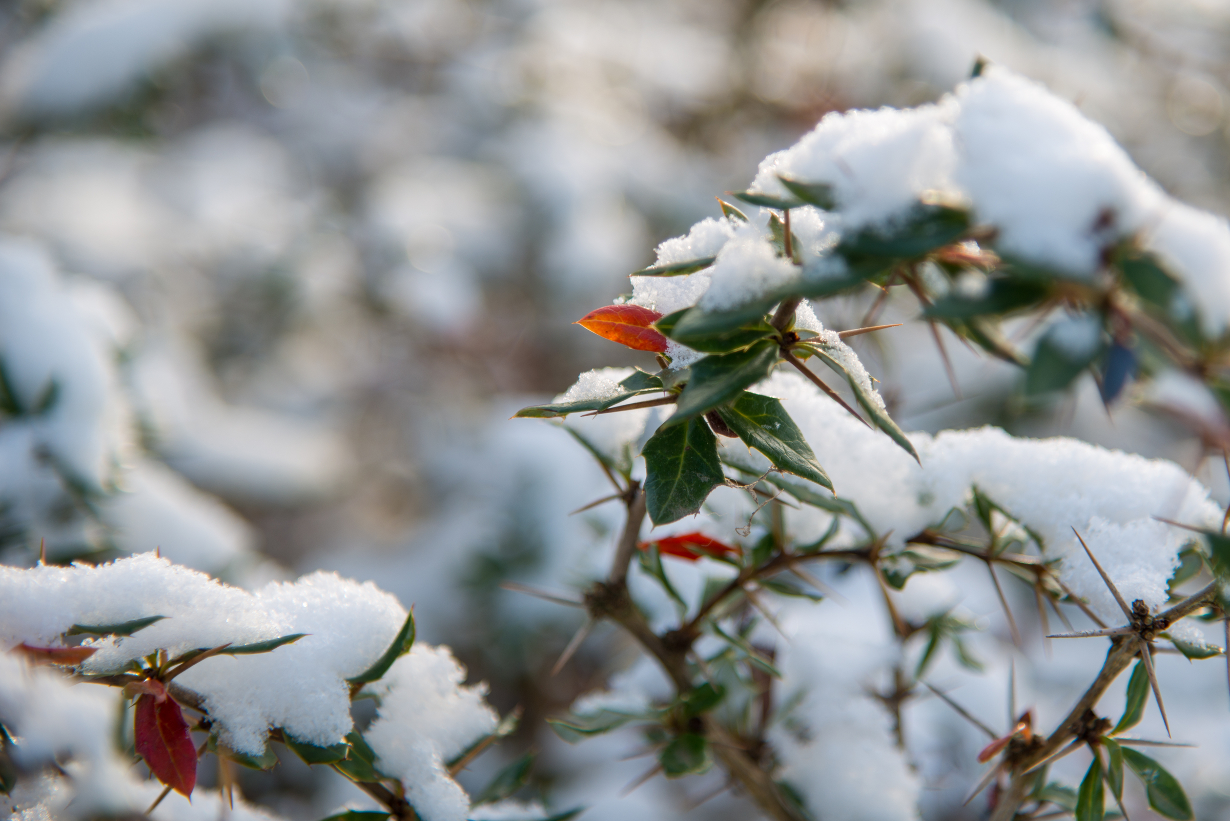 Schnee auf dornigem Zierbusch mit vereinzelten roten Blättern neben den Immergrünen