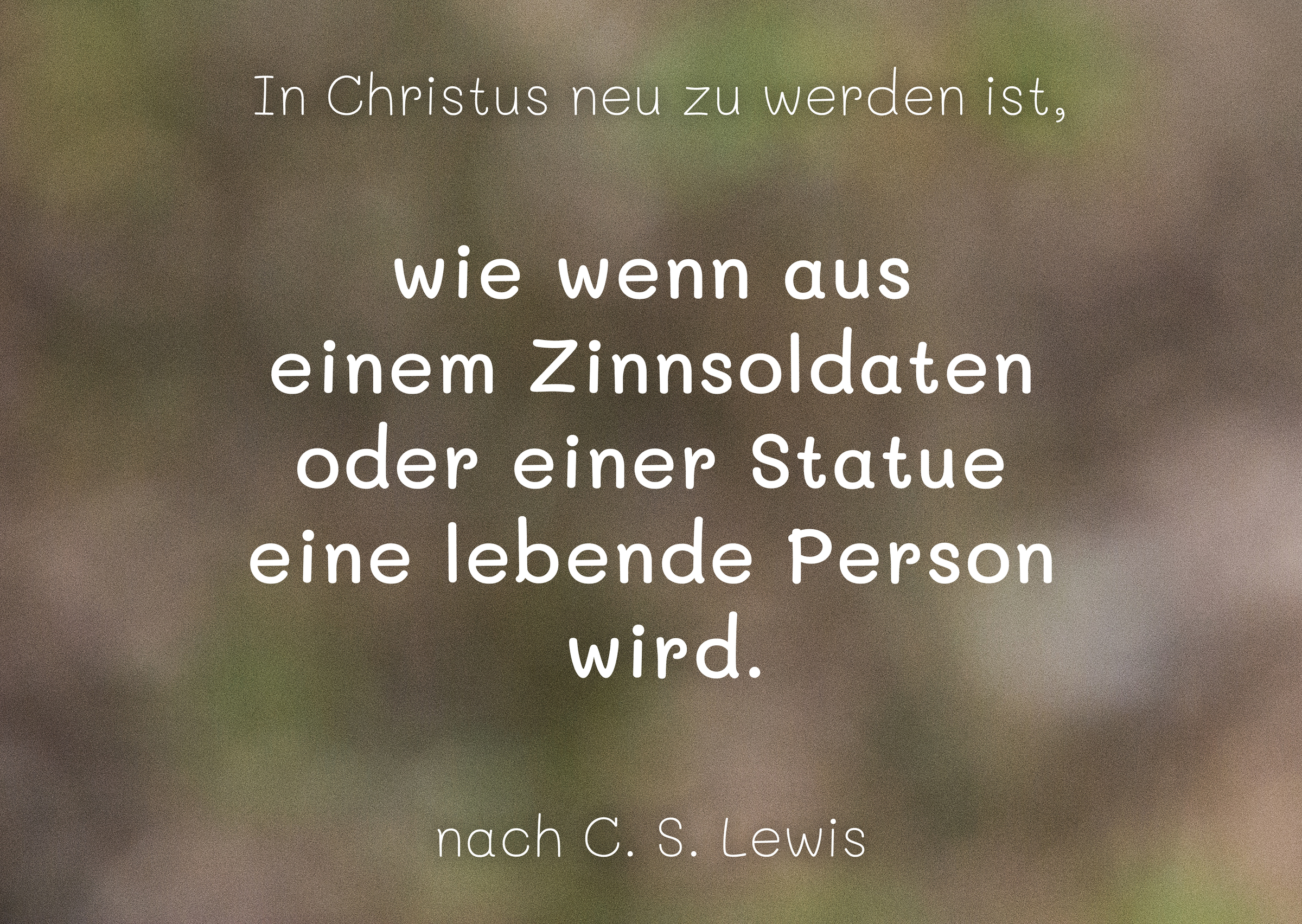 Das Bild ist Teil einer Plakat-Serie mit sprachlichen Bildern bzw. Metaphern, die C. S. Lewis in seinem Buch "Mere Christianity" für das Neu-Werden in Christus anbietet. Diese Bilder sind über die Kapitel des Buches verstreut und von mir aus dem Englischen ins Deutsche übertragen worden. Zur Gestaltung: Die Hintergrundbilder sind zumeist stark vergrößerte Ausschnitte aus den unscharfen Partien von Fotos, die sich hier in meiner Datenbank finden lassen. Die technischen Angaben beziehen sich jeweils auf das Hintergrundbild. Es handelt sich um das Bild ›Blätter0716‹.