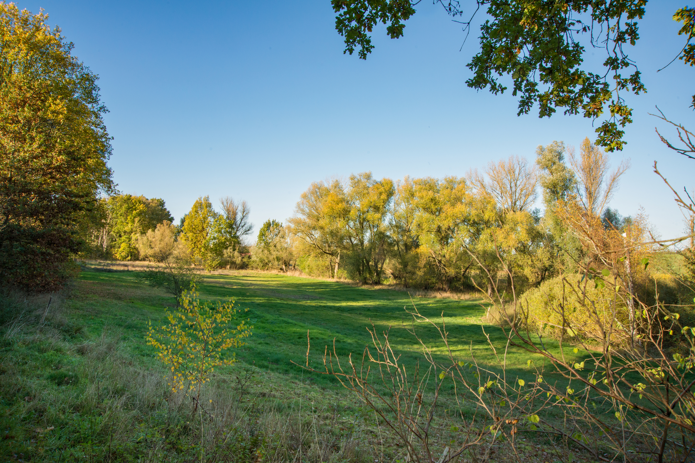 Aue im Schatten, die von herbstbunten Bäumen gesäumt ist, die unter blauem Himmel von der Sonne angestrahlt werden Aue7792