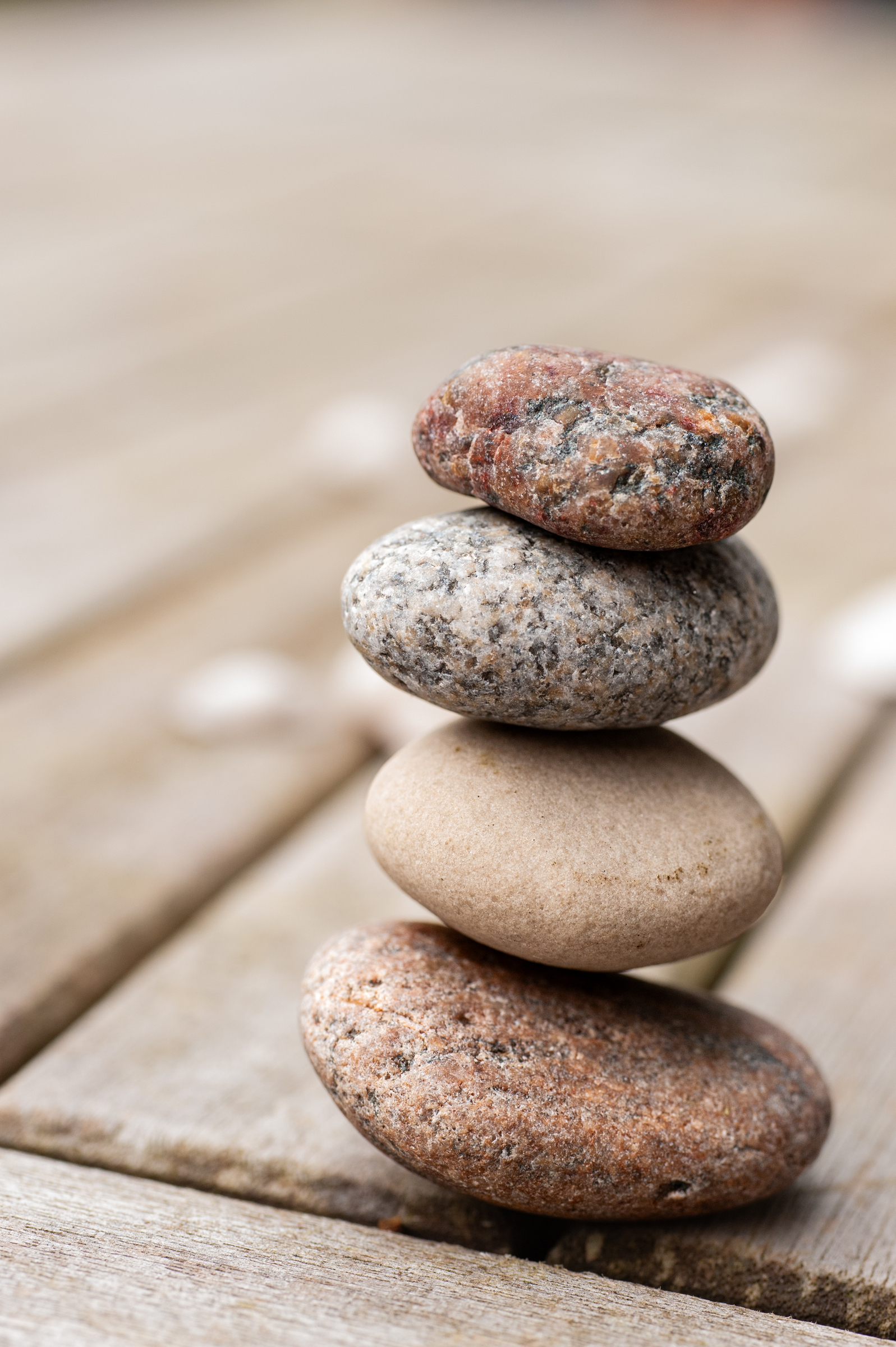 Eine kleine, aufeinander gestapelte Gruppe von vier glatten Steinen, die auf einem hölzernen Untergrund zu einem Turm ausbalanciert wurden. Die Steine sind unterschiedlich gefärbt – von rötlichen bis hin zu beigen und grauen Tönen – und haben eine natürliche, matte Textur. Der Fokus liegt auf dem Stein-Stapel, während der Hintergrund unscharf ist. Das Bild symbolisiert Balance und Stabilität und zeigt gleichzeitig die Schönheit einfacher, natürlicher Elemente.