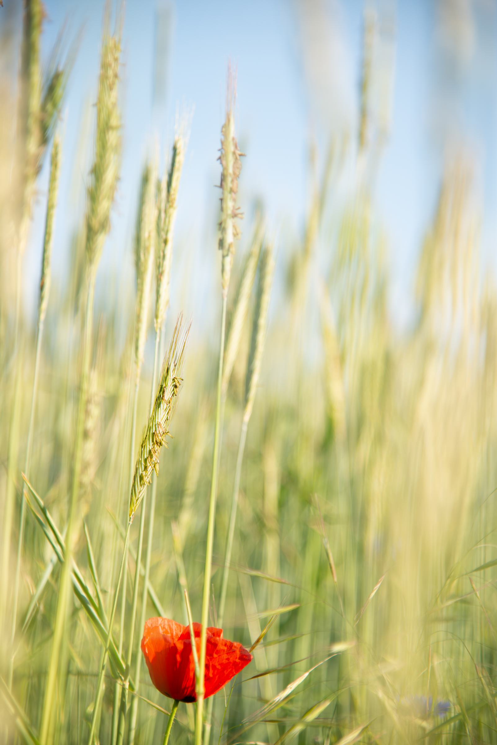 Die offene Blende erzeugte bei dieser Aufnahme einen ›natürlichen‹ Weichzeichner-Effekt: Während die eine Ähre scharf ist, liegt auf den Blütenblättern des Klatschmohns ein weicher Schein bzw. weist Streulicht auf. Um dem gestalterisch Rechnung zu tragen, ist das Foto in Pastelltönen ausgearbeitet. Das Bild ›Blühende8841‹ ist – zum Vergleich – dasselbe Motiv mit kleinerer (geschlossenerer) Blende.