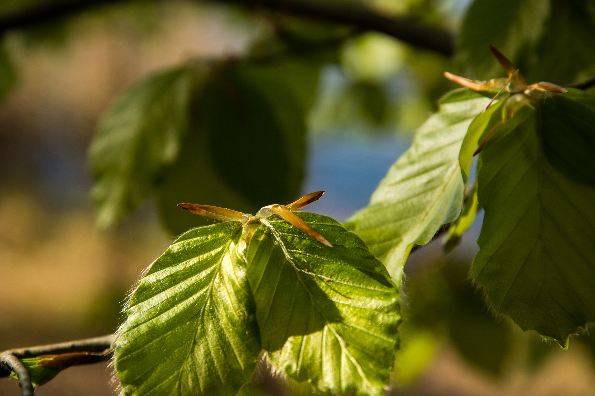 Zweige einer Buche mit frischem Blattgrün vor der sehr unscharfen Uferpartie des Bohnenländer Sees