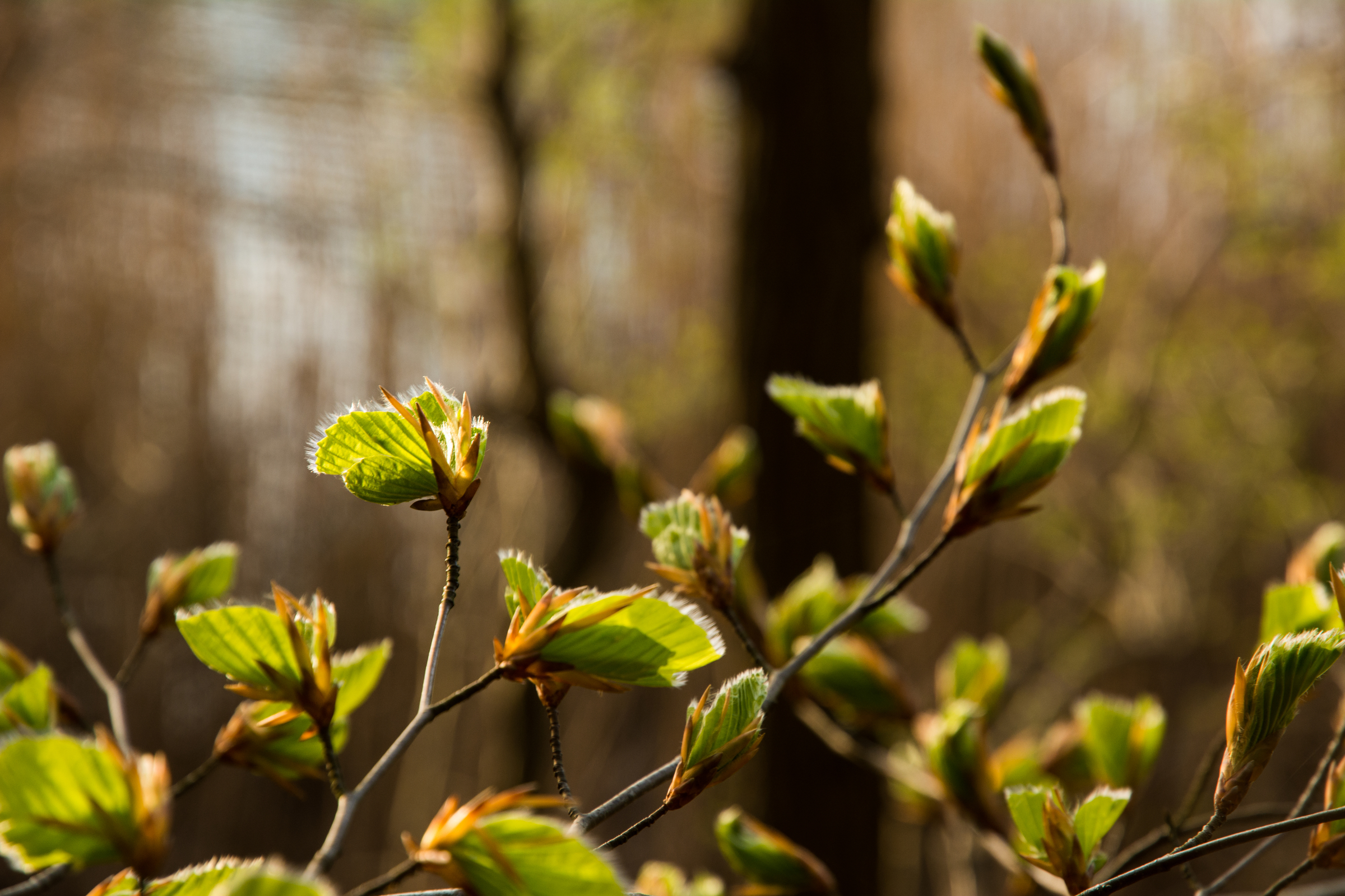 Buchenzweige mit vielen frisch aufgebrochenen Knopsen vor waldigem Hintergrund durch den blauer Himmel durchscheint Buchenzweige0792