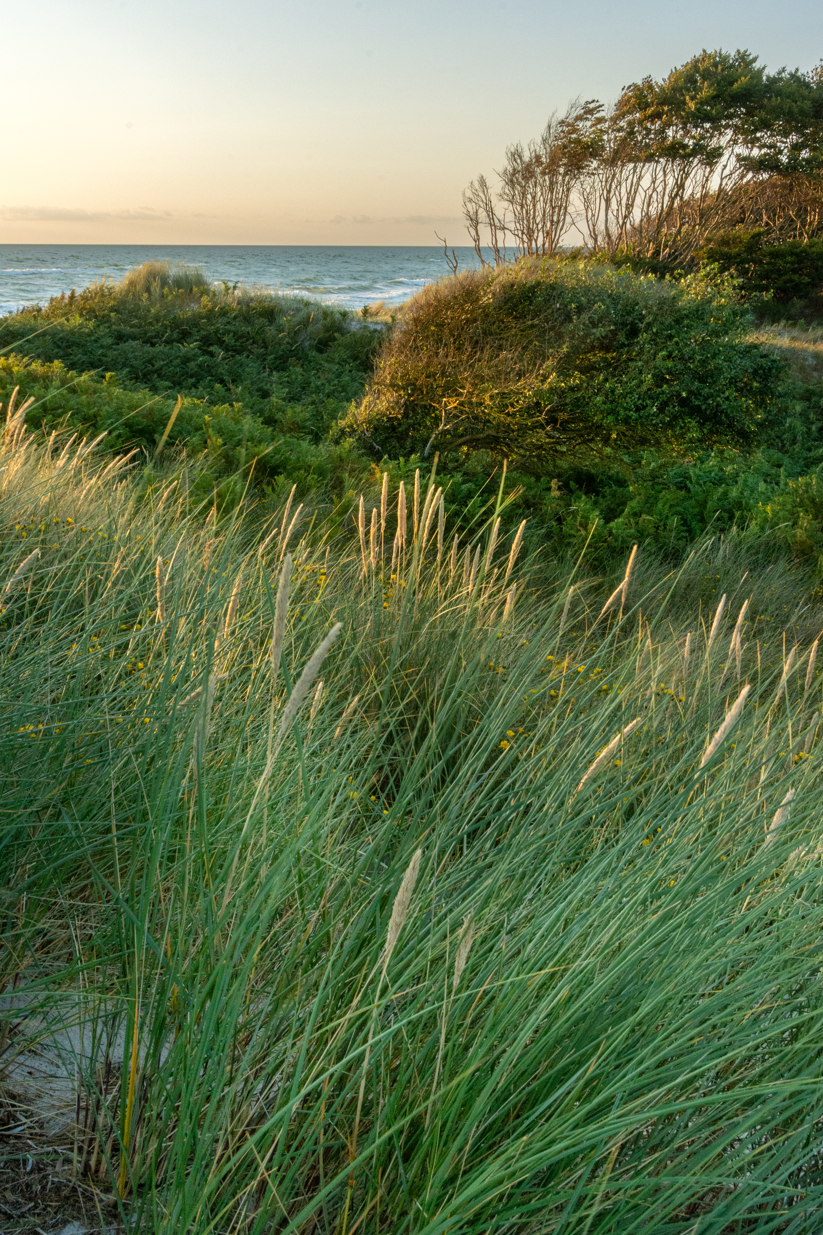 Küstenlandschaft mit hohen Dünengräsern an der Ostsee, die im auflandigen Seewind wehen, während im Hintergrund Wellen mit Schaumkronen gegen den Sandstrand rollen. Der goldene Lichtschein der tief stehenden Sonne am Abend taucht die Szene in warme Farben. Im Hintergrund sind windgebeugte Bäume sichtbar, die die Küstennähe und die raue Natur der Umgebung andeuten. Es gibt ein querformatiges Geschwisterbild, das ca. 70 Minuten früher aufgenommen wurde: ›Dünenlandschaft7431‹