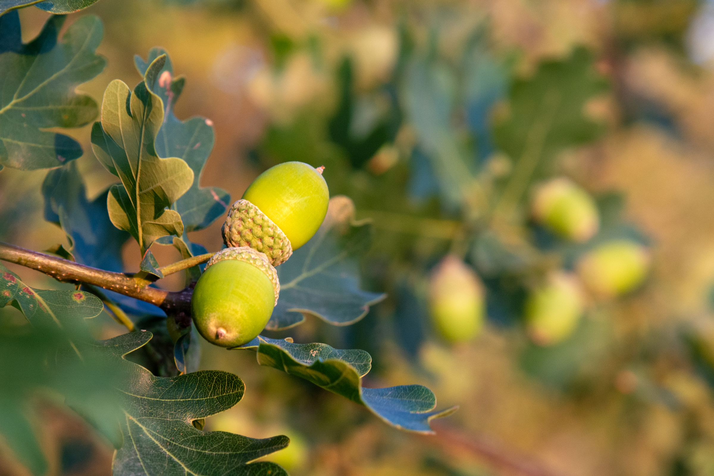 Im Mittelpunkt dieses Bildes stehen zwei grünliche Eicheln, die noch fest an ihren Fruchtbechern auf einem Ast sitzen. Das Eichenlaub umrahmt die Früchte mit seinen markanten, tief gezackten Blättern. Die Eicheln sind in verschiedenen Stadien des Reifeprozesses abgebildet, wobei die Vorderen in scharfem Fokus stehen, während im Hintergrund einige unscharfe Eicheln und Blätter in warmem Sonnenlicht zu sehen sind.