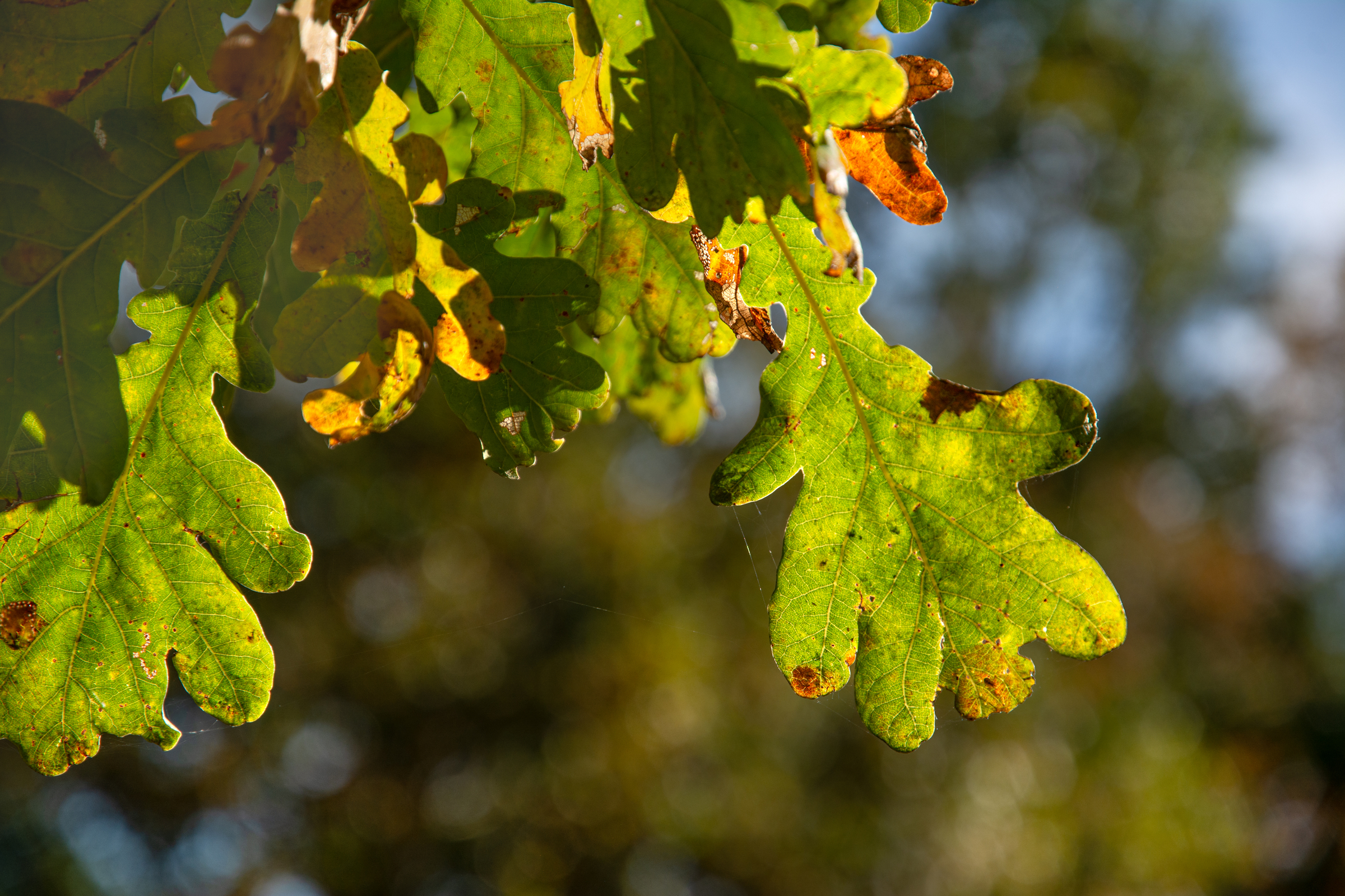 Die Blätter sind im Gegenlicht, so dass die Sonne durch sie hindurch scheint und ihre Adern und jahreszeitlichen Veränderungen gut sichtbar werden; im Hintergrund ist blauer Himmel zu erkennen.