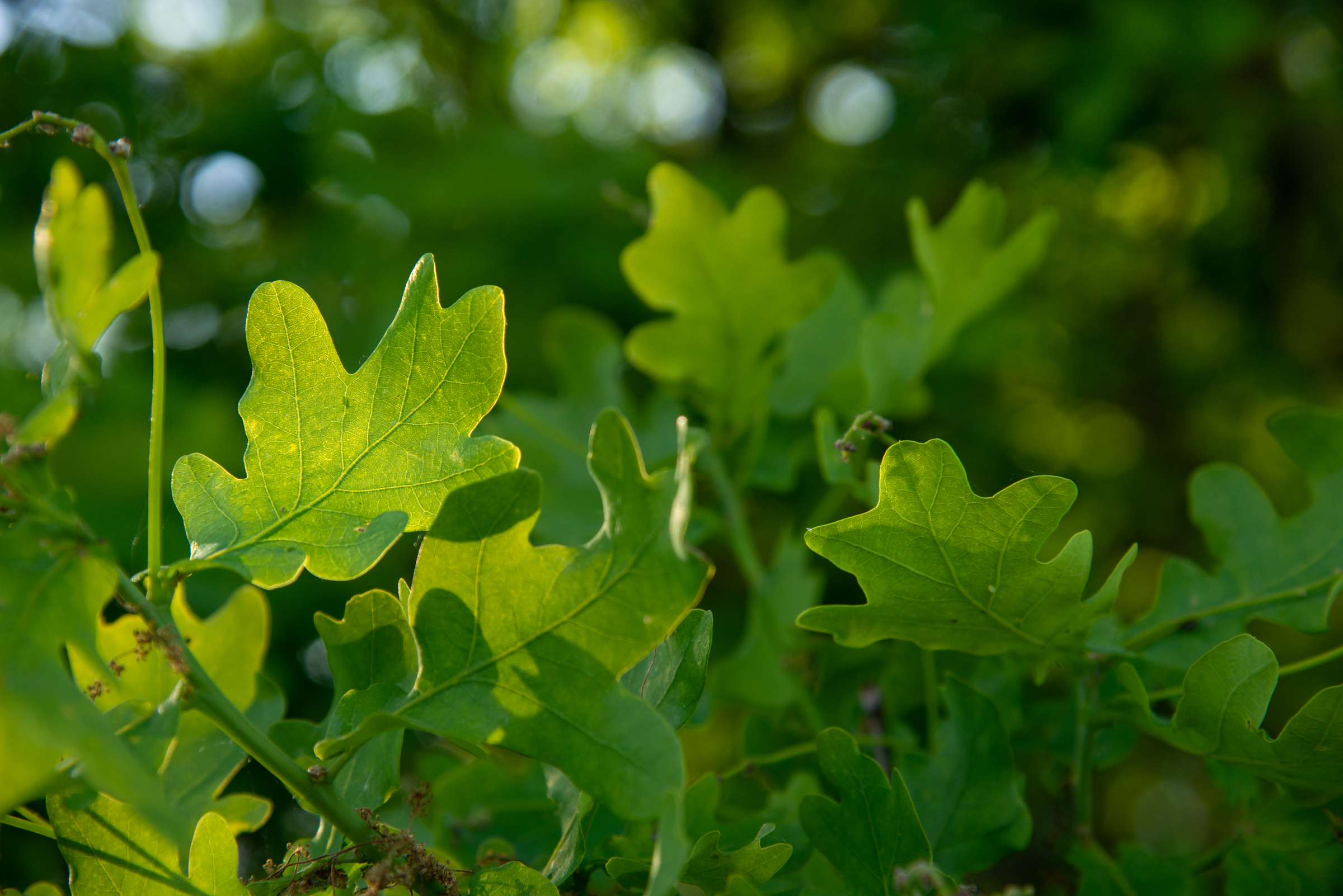 Eichenlaub im abendlichen Gegenlicht Ende Mai, dem man ansieht, das es noch ganz frisch ist