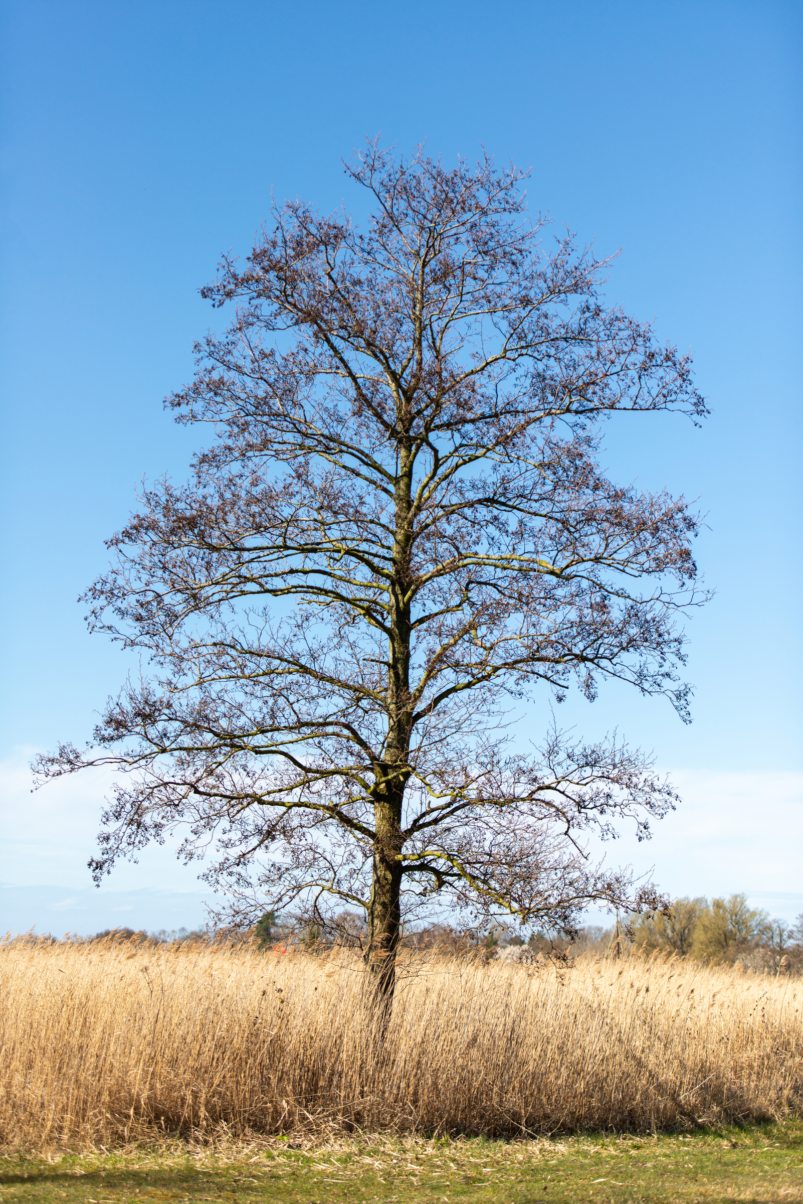 Erle vor strahlend blauem Himmel in einem noch gelben Schilfgürtel am Bodden