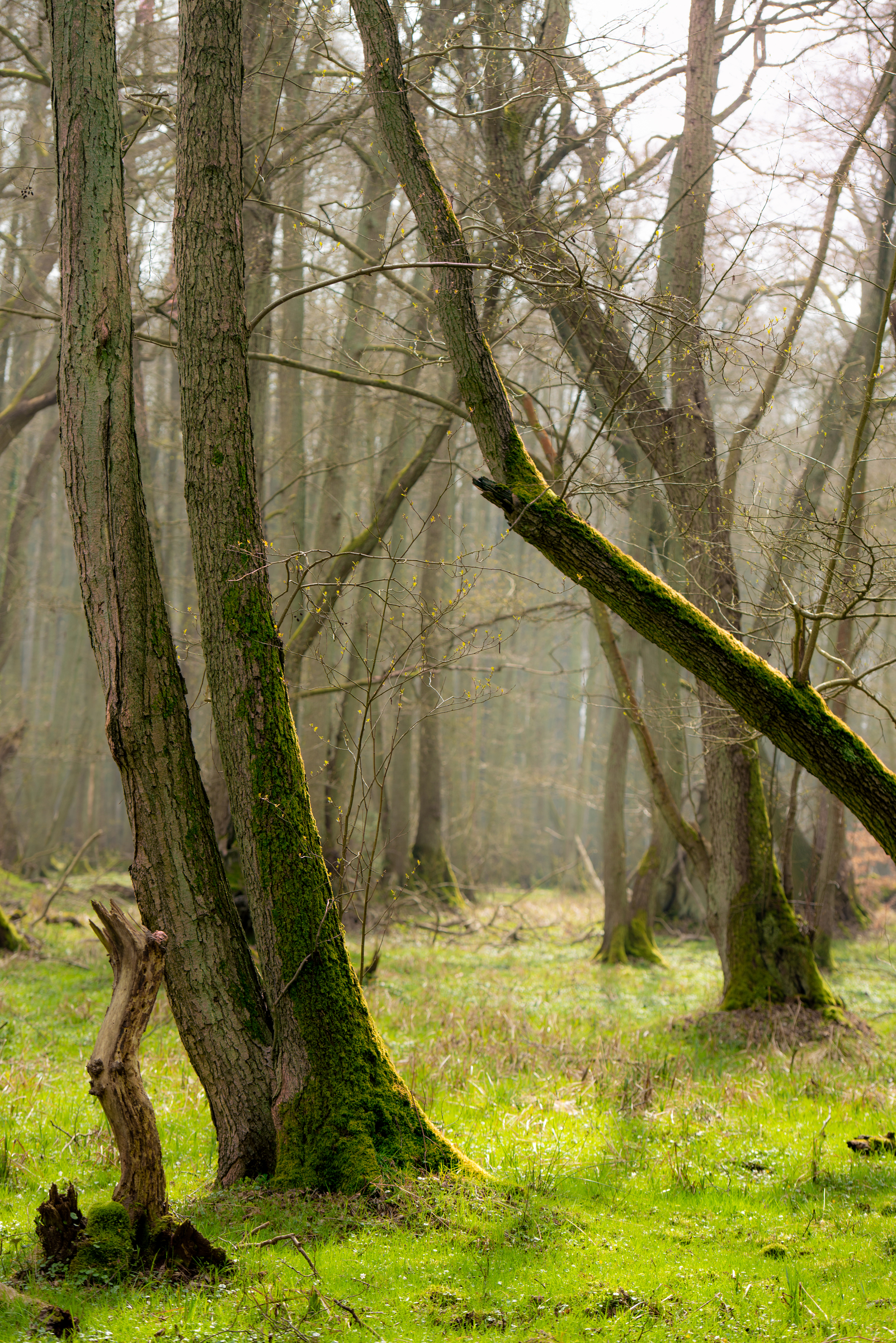 Das frische Grün am Boden wird von dem Moos auf dem Stamm der einen Erle unterstrichen.