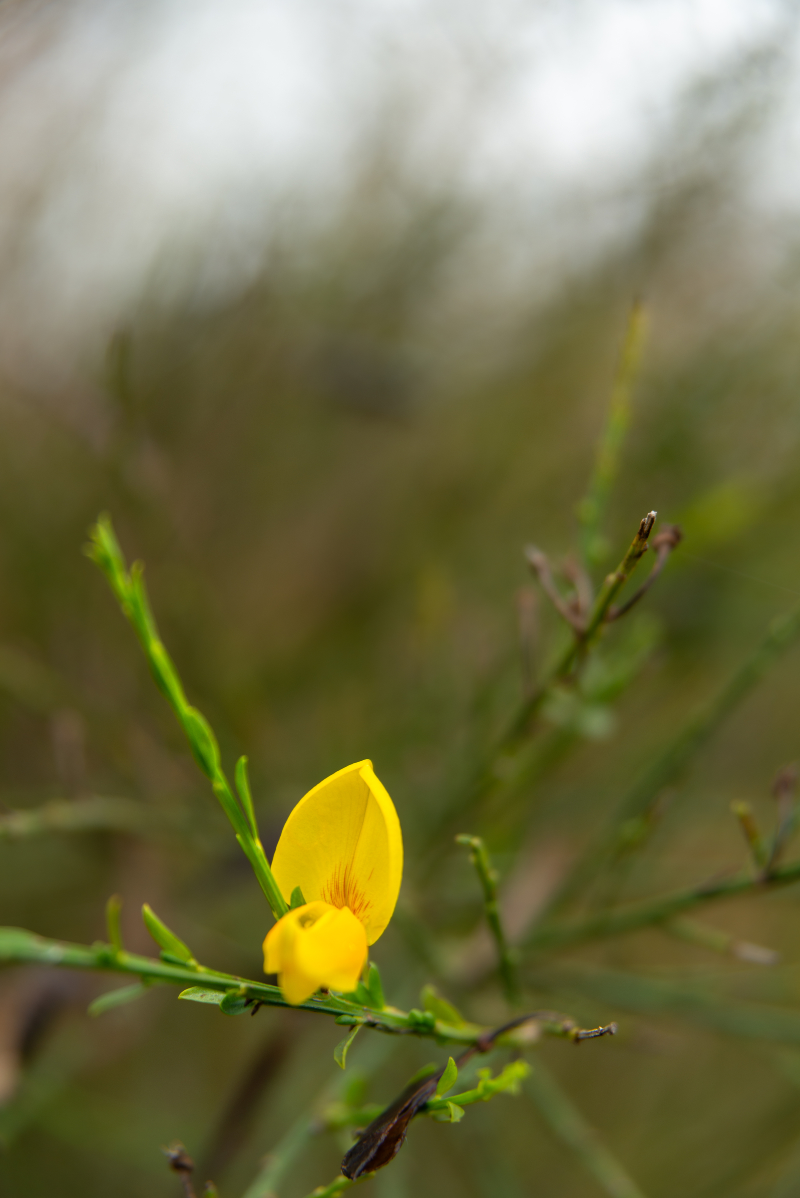 Einzelne, leuchtend gelbe Blüte, die von filigranen, grünen Zweigen umgeben ist. Die Blüte ist nach vorne gerichtet, während die langen, schmalen Zweige einen diffusen Hintergrund aus unscharfem Grün und Grau bilden. Die Blüte gehört zu einem Besenginster (Cytisus scoparius), einer Pflanze, die oft an offenen, sandigen Standorten vorkommt. Das Bild vermittelt eine minimalistische, ruhige Atmosphäre. Um die Wirkung unterschiedlicher Blenden studieren zu können, zeigt ›Ginsterblüte0163‹ das Motiv mit etwas mehr Tiefenschärfe.