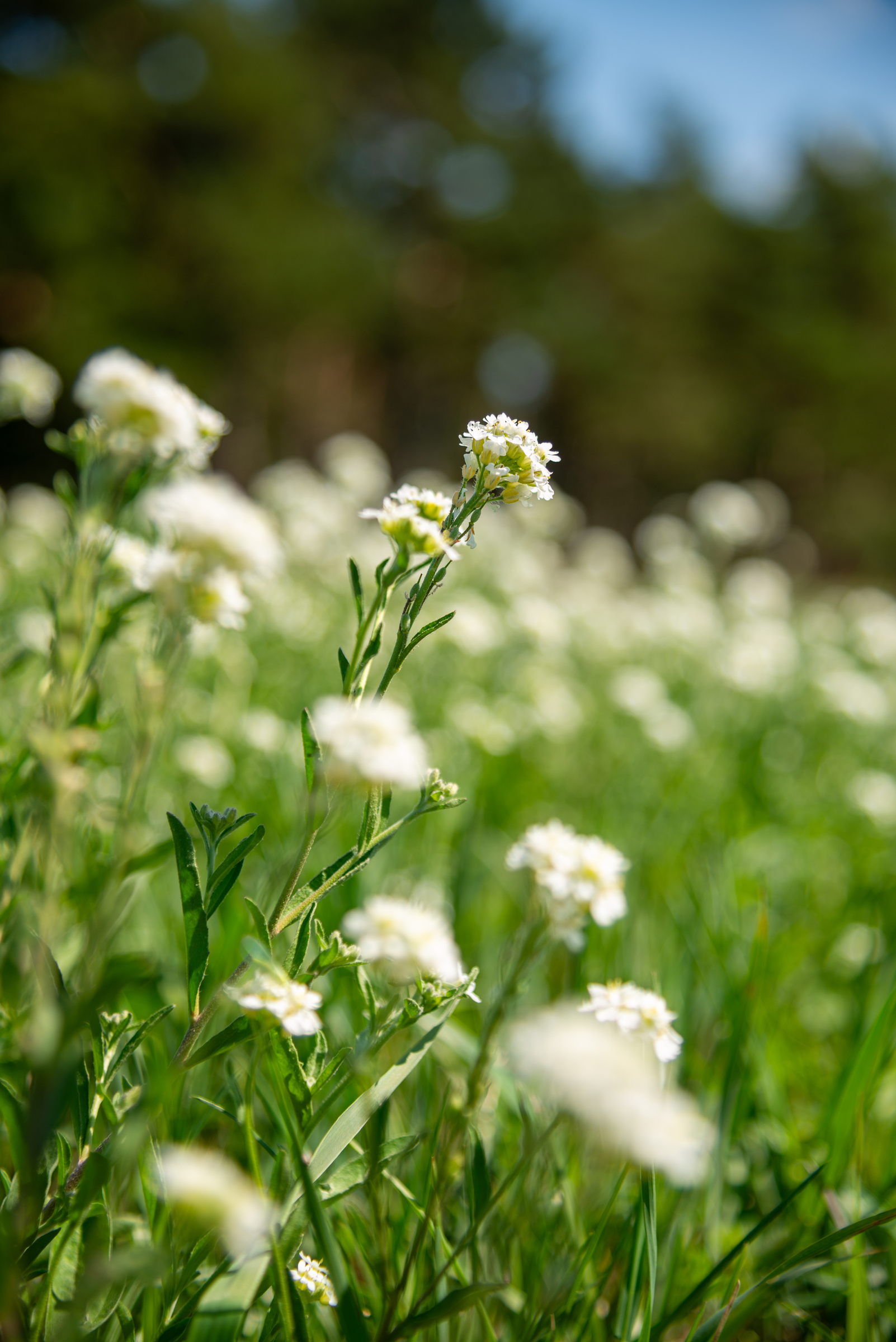 In einem Feld von Graukresse (Berteroa incana) steht eine einzelne Pflanze im Fokus, umgeben von einem Meer aus unscharfen weißen Blüten. Im Hintergrund ist ein Waldstück zu erkennen, das die Wiese begrenzt und über dem ein Stück blauer Himmel auszumachen ist.