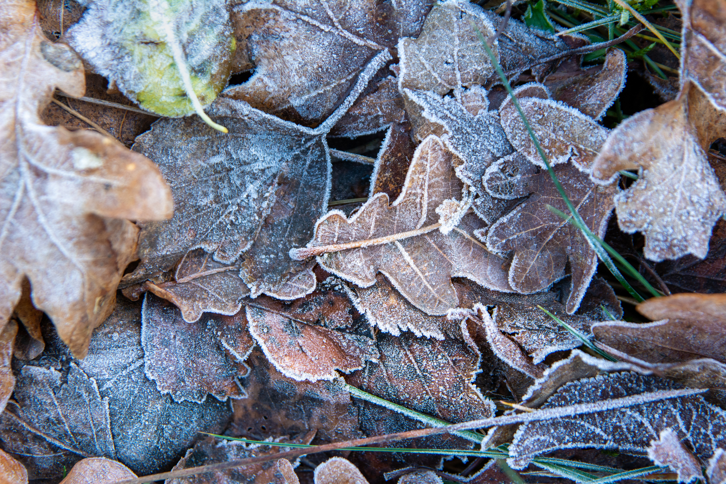 Blätter von Birke und Eiche liegen auf dem Boden, Gras schaut zwischen dem Laub hervor. Vor allem seine Ränder und die Blattadern hat der Frost mit Eiskristallen verziert.