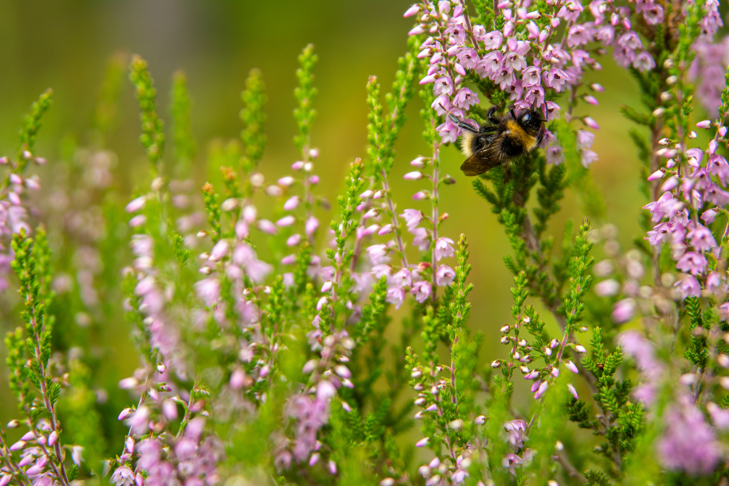 Erika mit Blüten in Nahaufnahme mit Insekt (Hummel)