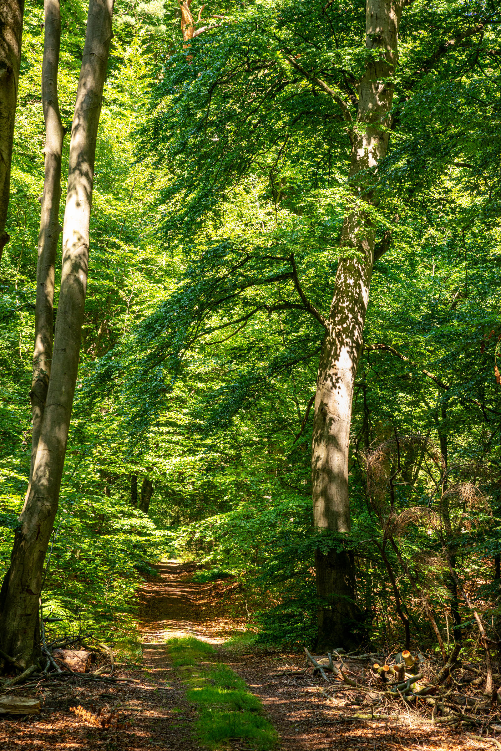 Waldweg, der von hohen Bäumen umgeben ist. Das Sonnenlicht bricht durch das Blätterdach und wirft lebendige Schatten auf den Boden. Der Pfad führt tief in den Wald hinein und verschwindet im Grün der Blätter. Die Bäume ragen hoch auf und bilden eine natürliche Allee, während der Waldboden mit Blättern und Ästen bedeckt ist. Zwei Buchen sind links und rechts des Weges deutlich zu erkennen sowie die Krone einer Kiefer durch eine Lücke im Blätterdach.