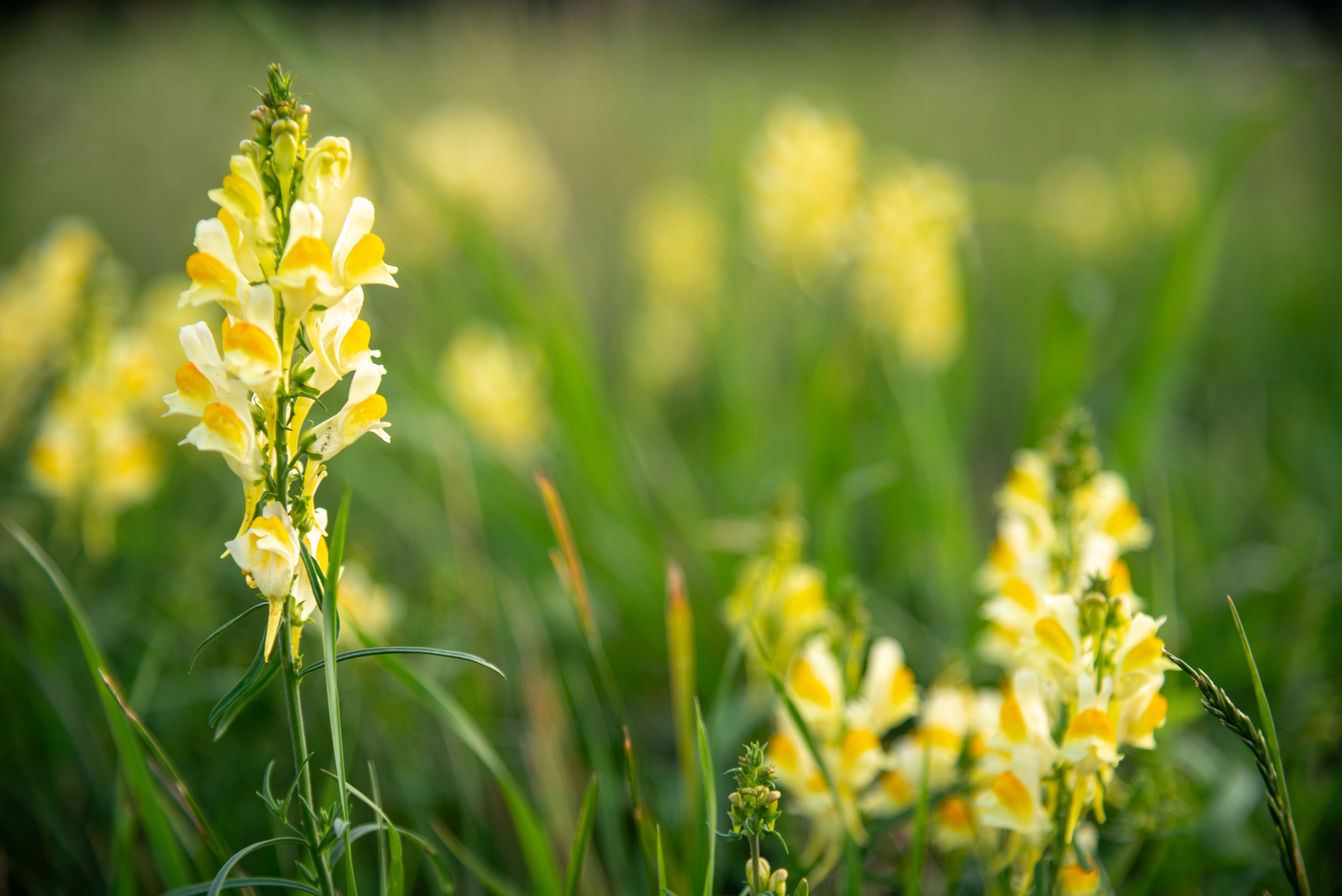 Inmitten einer grünen Wiese erhebt sich eine Blüte des Echten Leinkrauts (Linaria vulgaris), in zarten Gelb- und Cremetönen, umgeben von weiteren, unscharfen Blüten im Hintergrund. Die grazilen Blütenköpfe stehen aufrecht und ragen aus dem dichten Grün hervor, wodurch das Bild eine sanfte Tiefe erhält. ›Linaria9701‹ ist dasselbe Motiv mit kleinerer Blende und damit größerer Tiefenschärfe aufgenommen.
