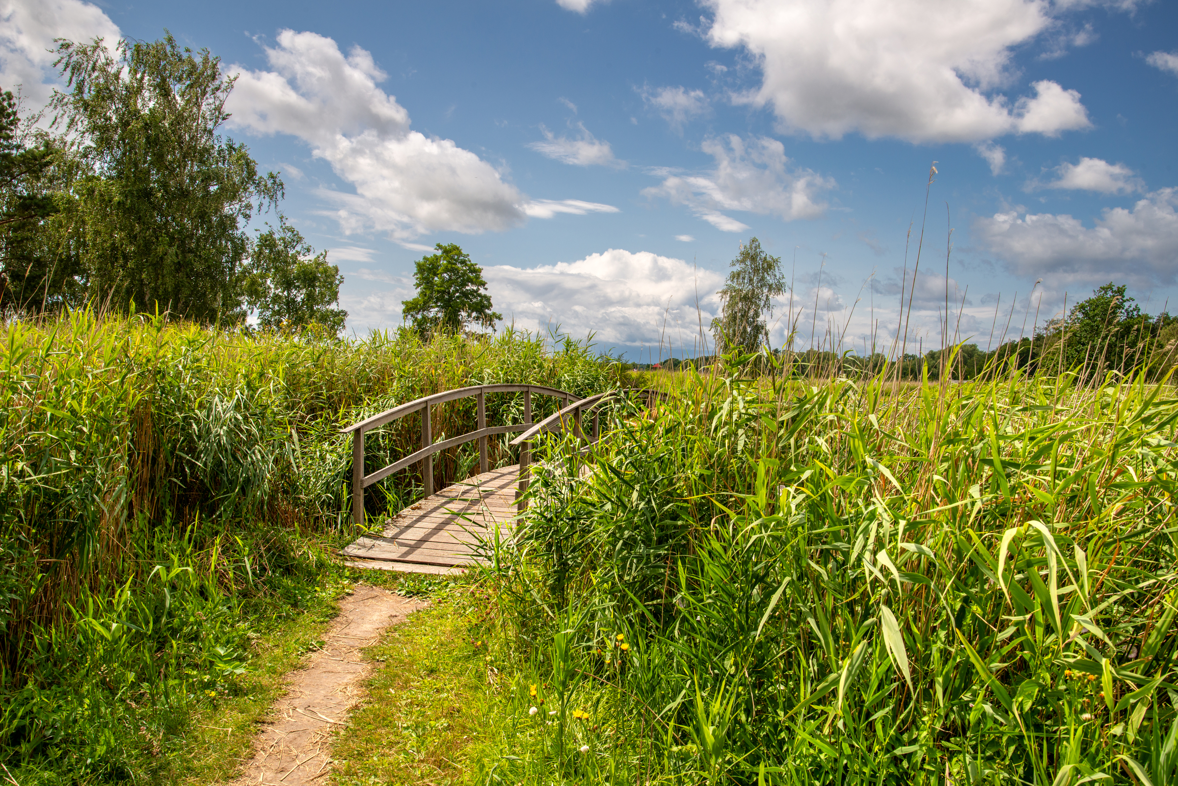 Kleine Holzbrücke für Fußgänger; der Fußweg ist von grünem Gras umsäumt, scheint oft begangen zu werden. Um die Brücke herum erstreckt sich eine dichte Vegetation aus hohem Gras und Schilfrohr, die einen natürlichen Tunnel bildet. Im Hintergrund breitet sich die Landschaft mit vereinzelten Bäumen aus, die in einen weiten blauen Himmel übergehen, der von malerischen weißen Wolken durchzogen ist. Die Wolken werfen sanfte Schatten auf die saftig grüne Wiese im Hintergrund, was die ruhige, idyllische Stimmung unterstreicht.