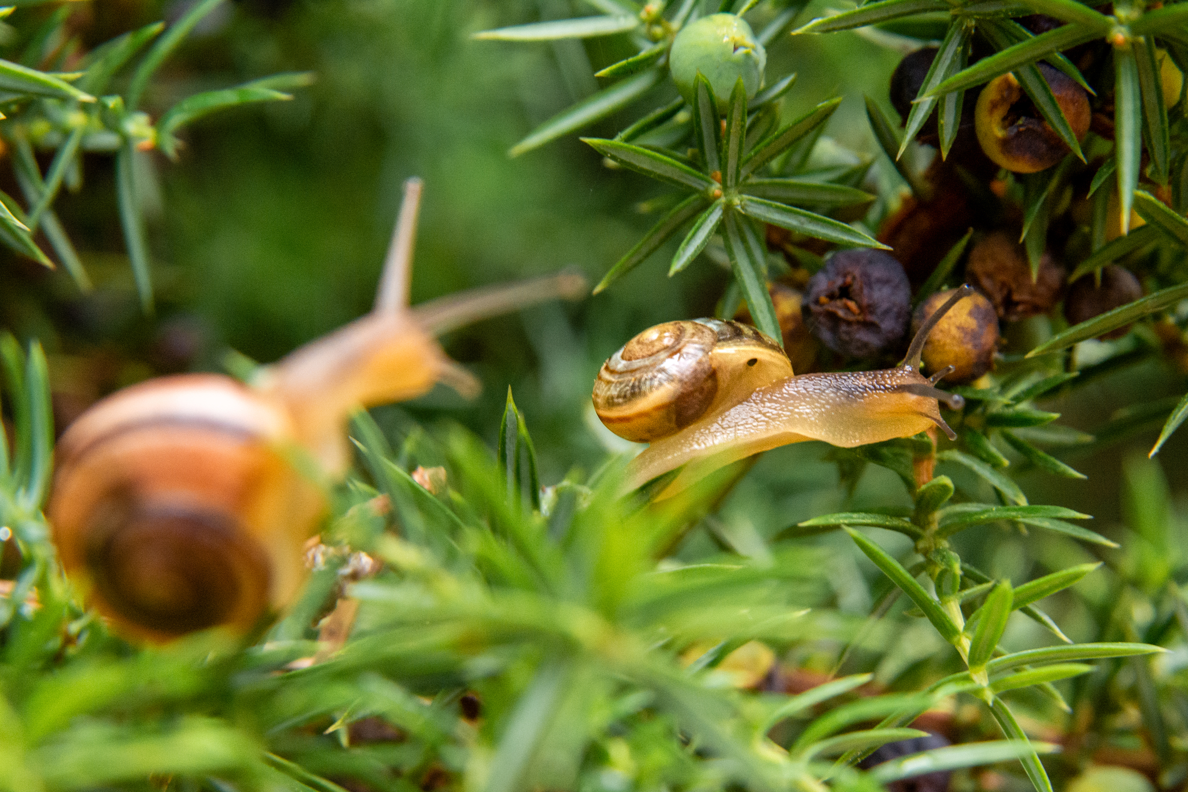 Zwei kleine Schnecken kriechen über Wacholdernadeln in einem Busch, eine etwas unscharf im Vordergrund, die zweite scharf als Motiv im Mittelgrund, während das Gehölz im Hintergrund in weiche Unschärfe fällt.