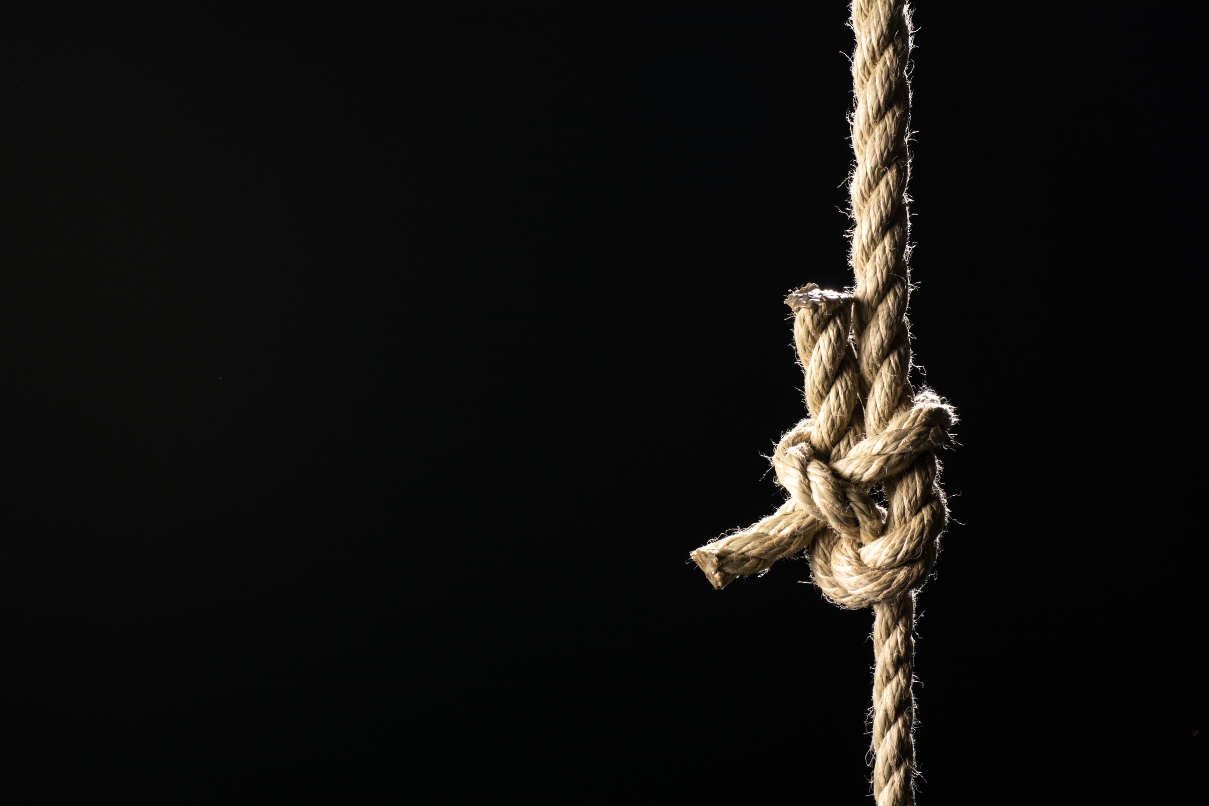 Der Knoten wurde mit zwei naturfarbenen Seilen gemacht; er steht unter Zug; das Fotos bietet Raum für Text