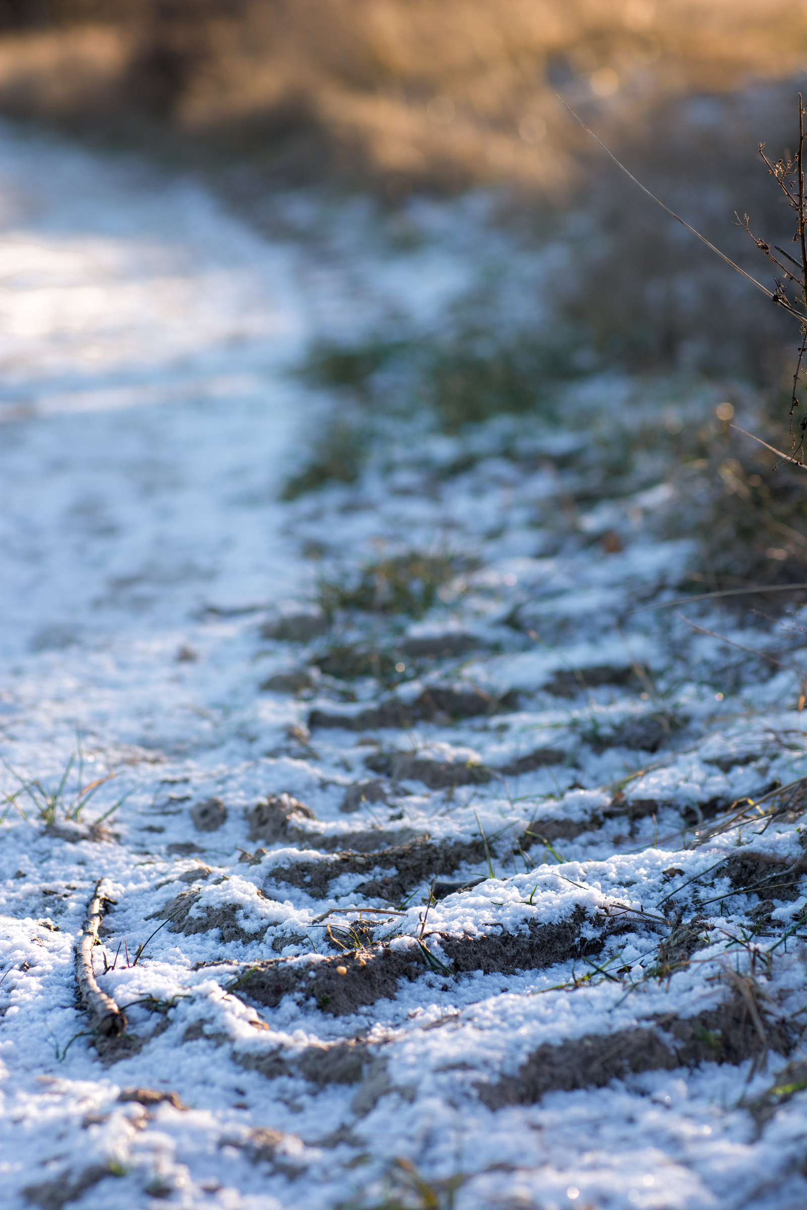 Der Fokus liegt auf einem tiefen Abdruck eines Traktorreifens in Sand – der Frost macht, dass die Spur im Sand ›eingefroren‹ ist; es ist zu erkennen, dass der Schnee nachträglich gefallen ist.