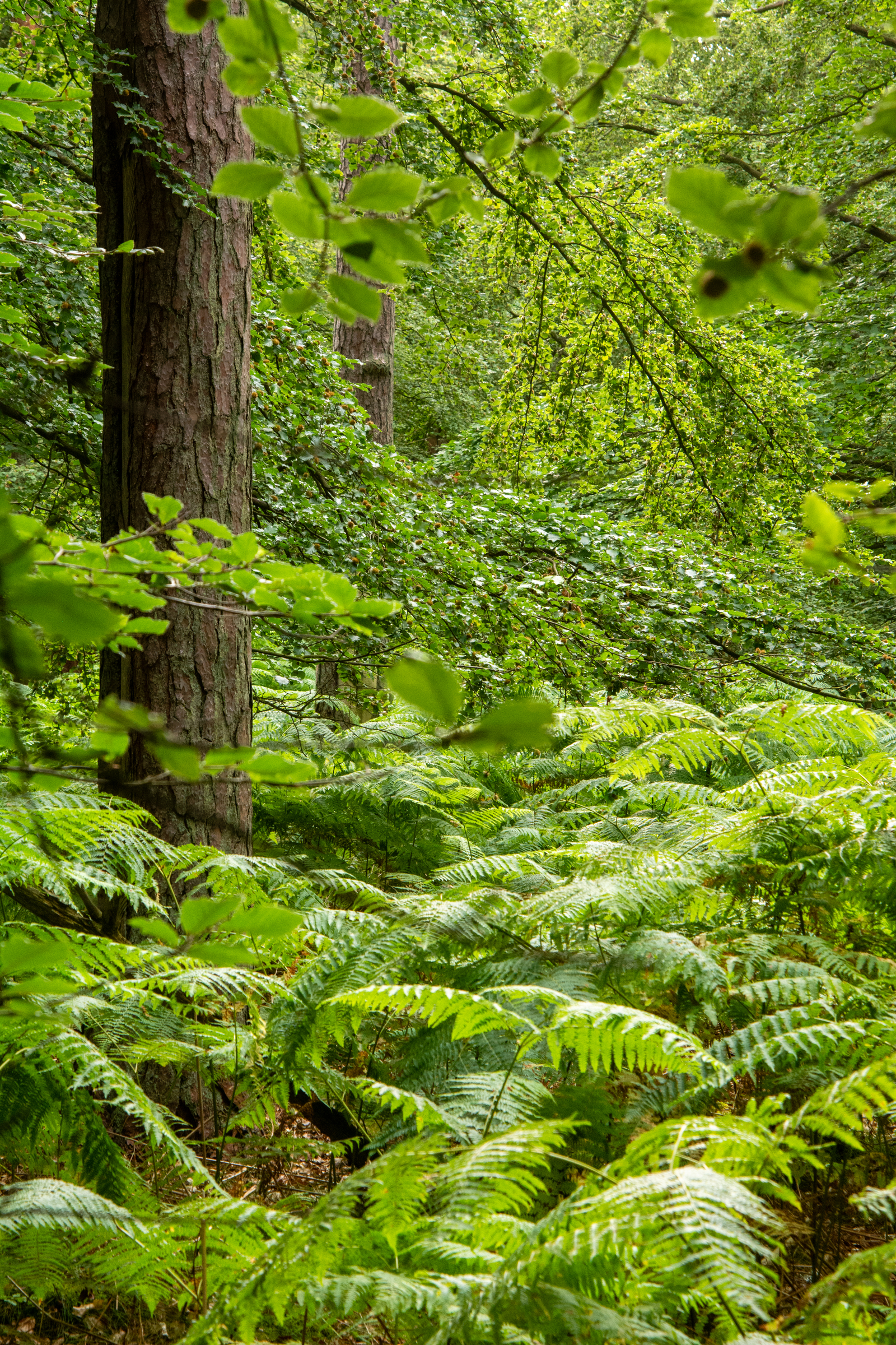 Zwei Kiefernstämme geben dem Foto Struktur, während sonst alles ineinander wächst: Einige Buchenzweige mit Früchten und auch größere Äste ragen ins Bild; sonst gibt es noch Farne, die den Boden bedecken – und fast alles ist grün!