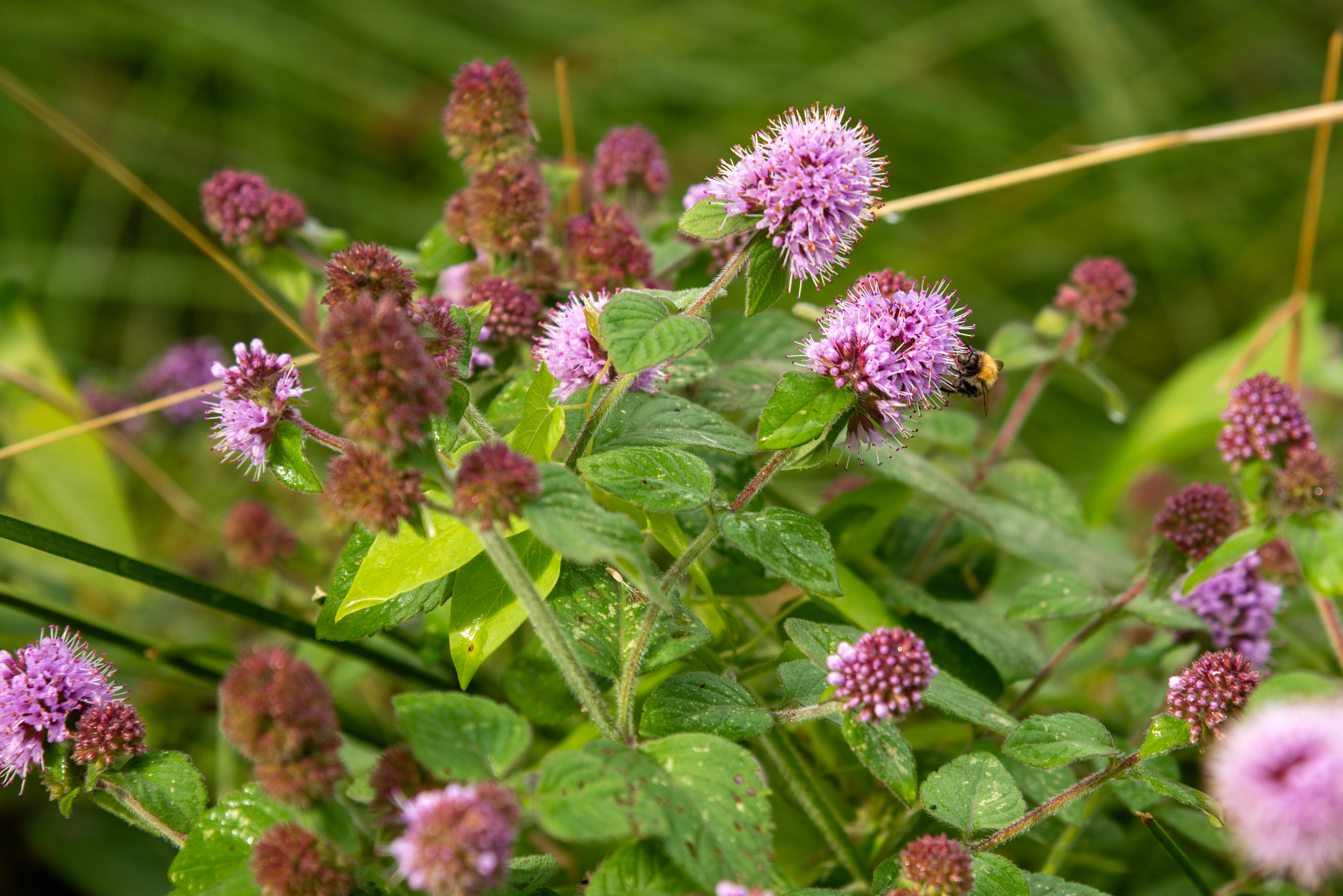 Wasserminze mit Hummel vor Schilfgürtel