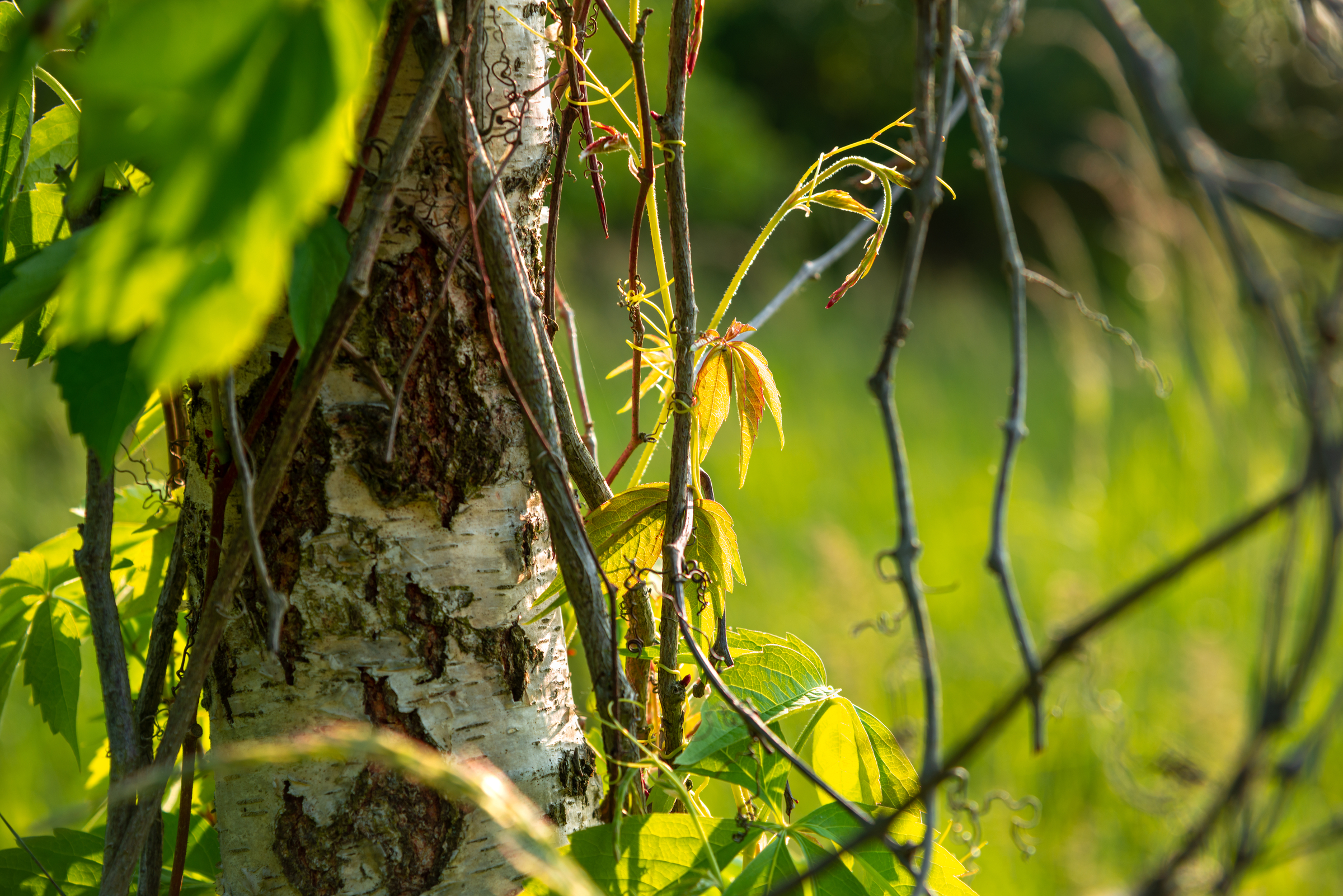 Ausgehend von den jungen Ranken und Weinblätter wandert der Blick zu dem Birkenstamm und weiter zu der grünen Lichtung im Hintergrund. In den Details fällt die Dynamik auf, mit der sich die Pflanzen entwickeln. Die Bildkomposition hat die Dreiteilung von Vorder-, Motiv- und Hintergrund.