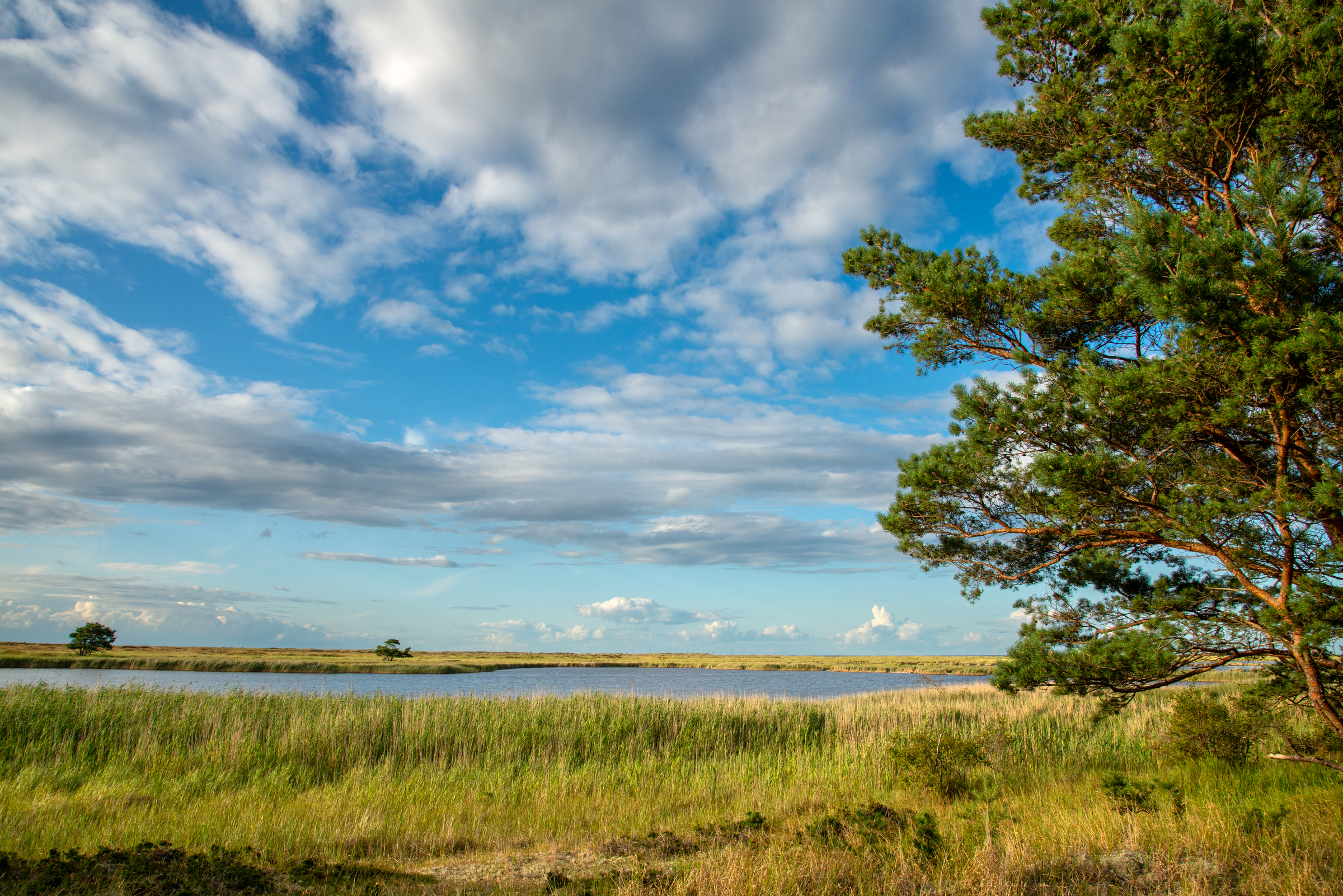 Szenerie am Darßer Ort, mit einem breiten Gewässer im Mittelgrund, umgeben von Schilf und hohen Gräsern. Der Himmel ist blau und mit vereinzelten Wolken bedeckt. Rechts im Bild steht eine markante Kiefer, die mit ihren ausladenden Ästen über die Szene ragt. Die Vegetation im Vordergrund schimmert in verschiedenen Grüntönen, während der Horizont in der Ferne durch eine flache Ebene verläuft, die den Blick in die Weite zieht.
